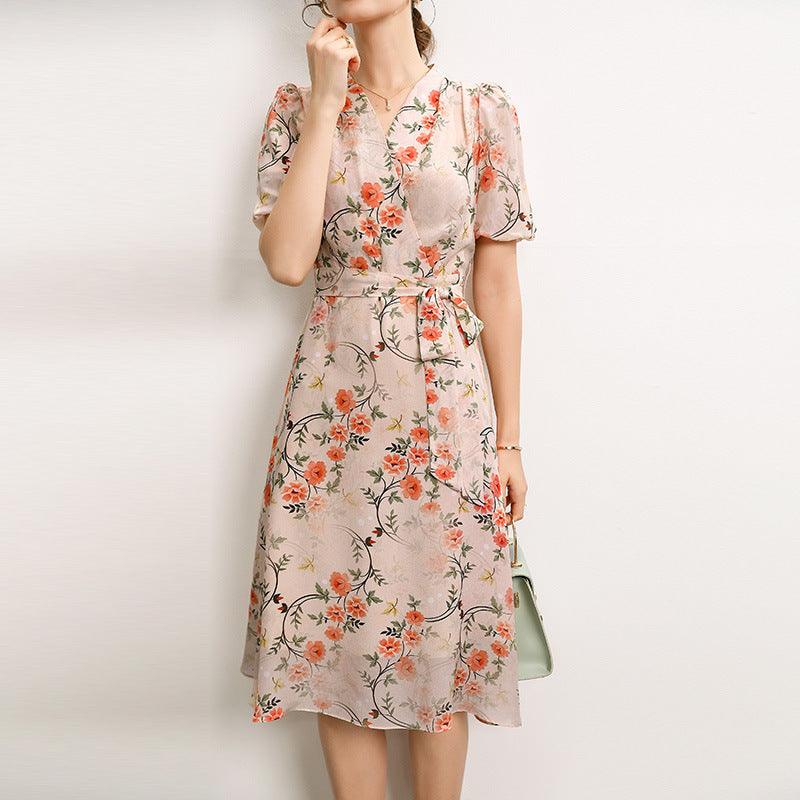 100% Mulberry Silk Midi Dress Floral, Embroidered Dress, Fashion Runway Summer Dress