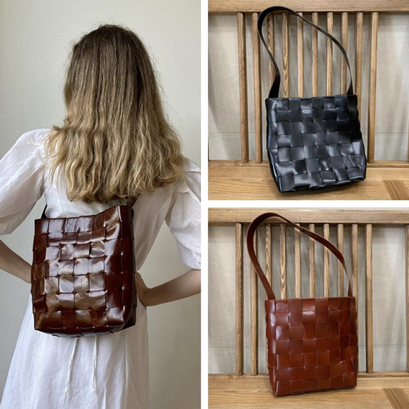 Cowhide Leather Bucket Bag Handwoven Chocolate Brown, Coffee, Black, Retro Medium Purse Womens Cinch Shoulder Bag, Gift for Her