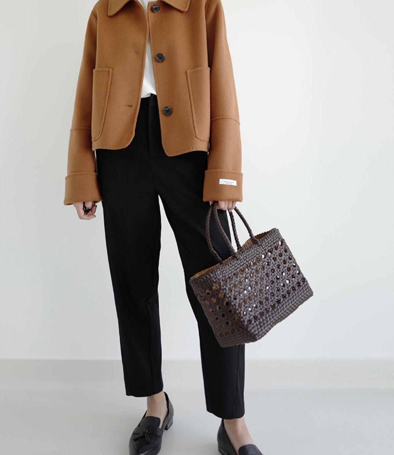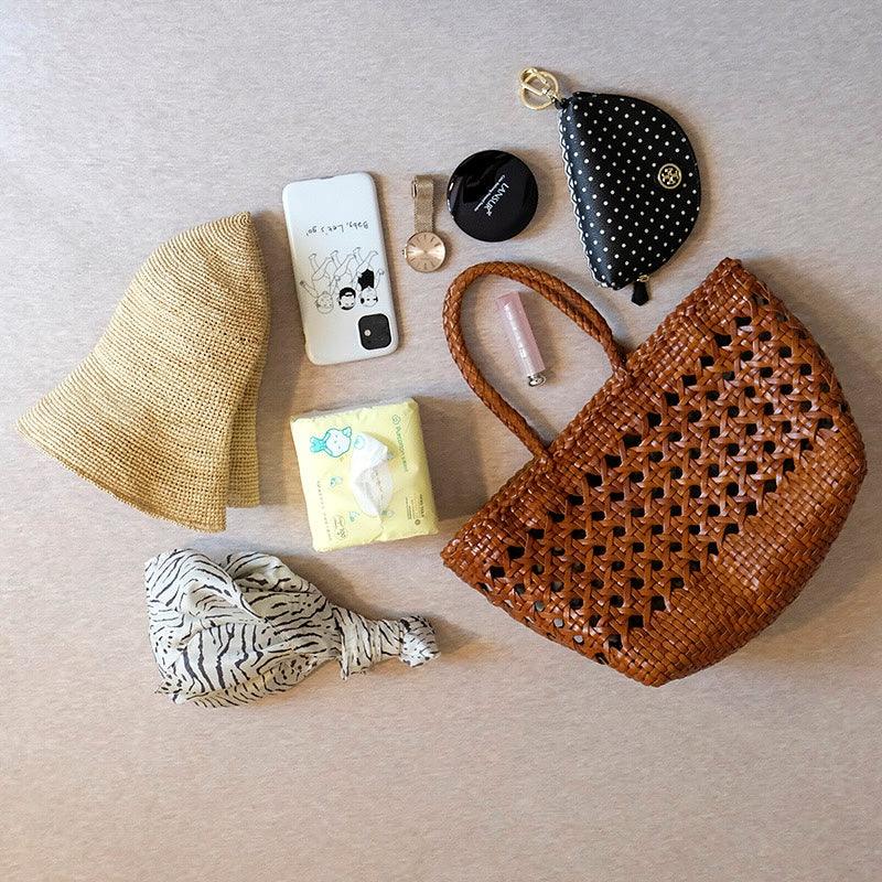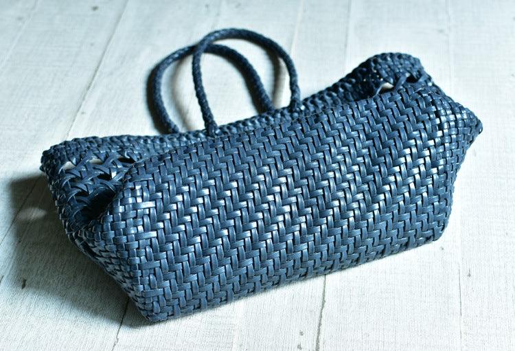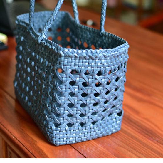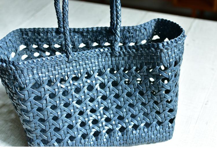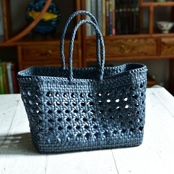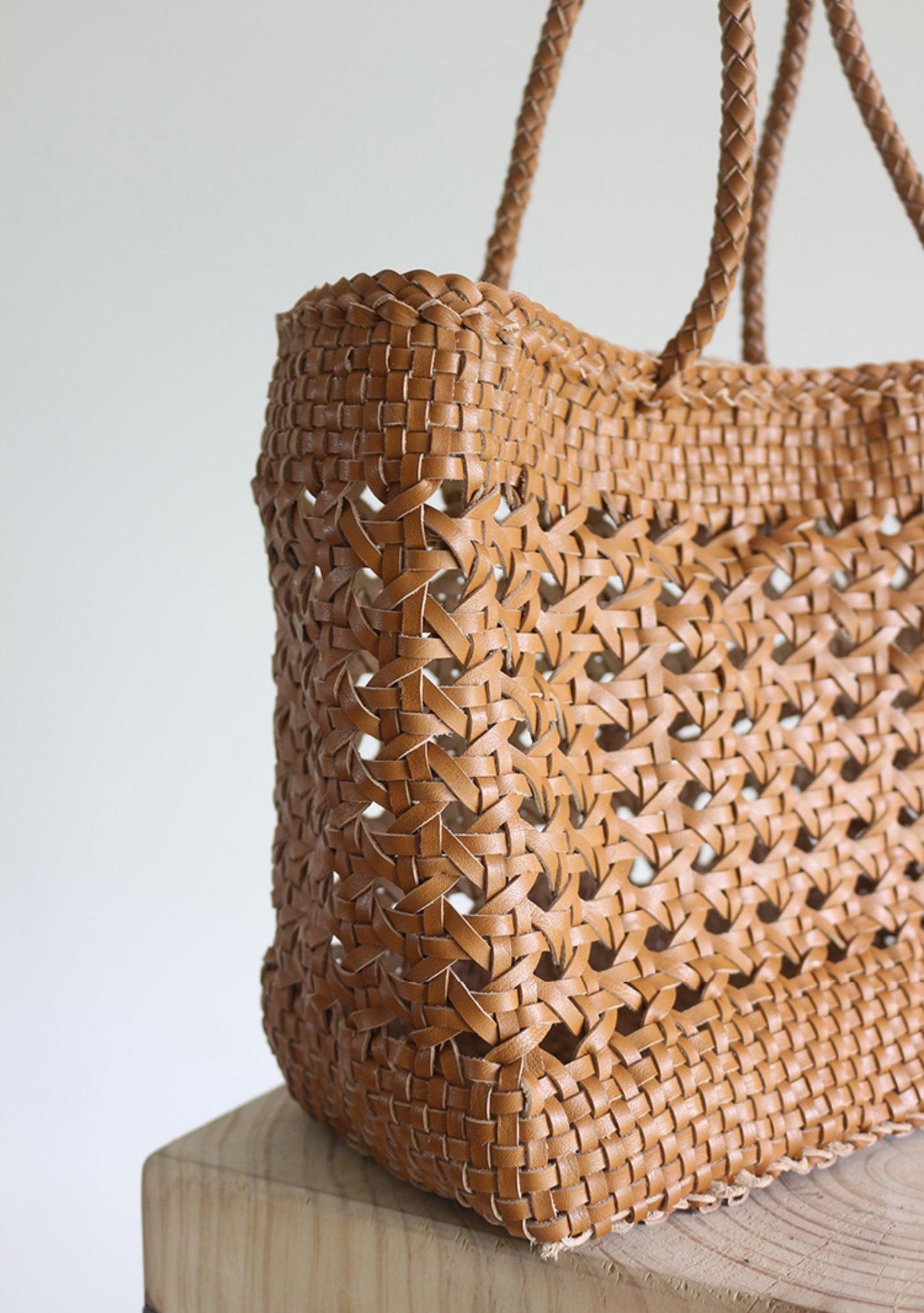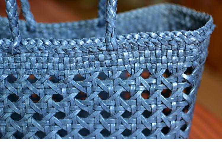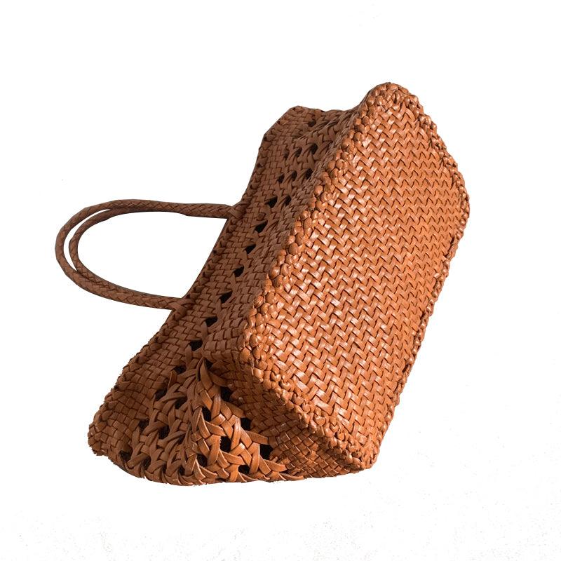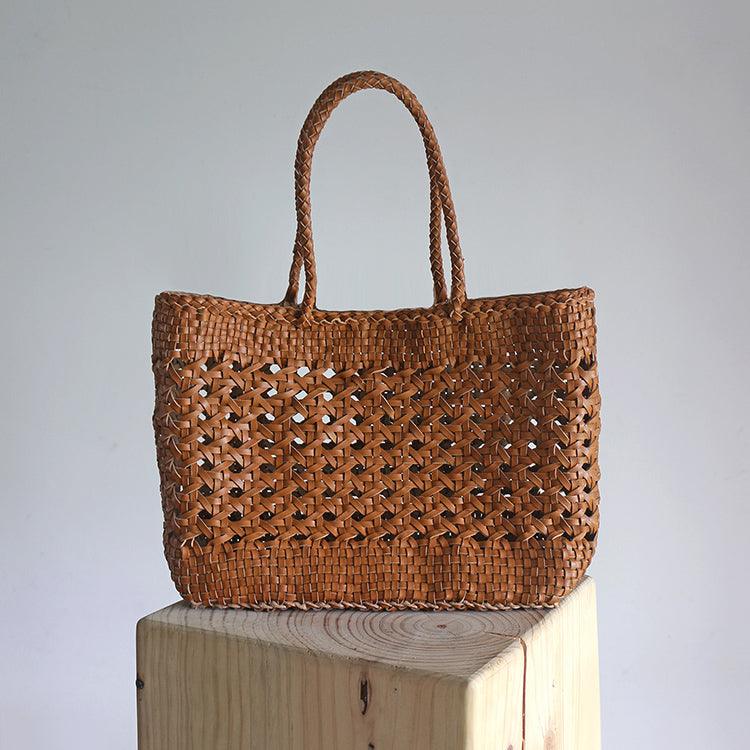 Genuine Leather Hand Woven Cuboid Shaped Ladies Tote Bag | Open Rattan Woven Triple Jump Bamboo Ladies Hobo Holiday Bag, Weekend Basket Bag