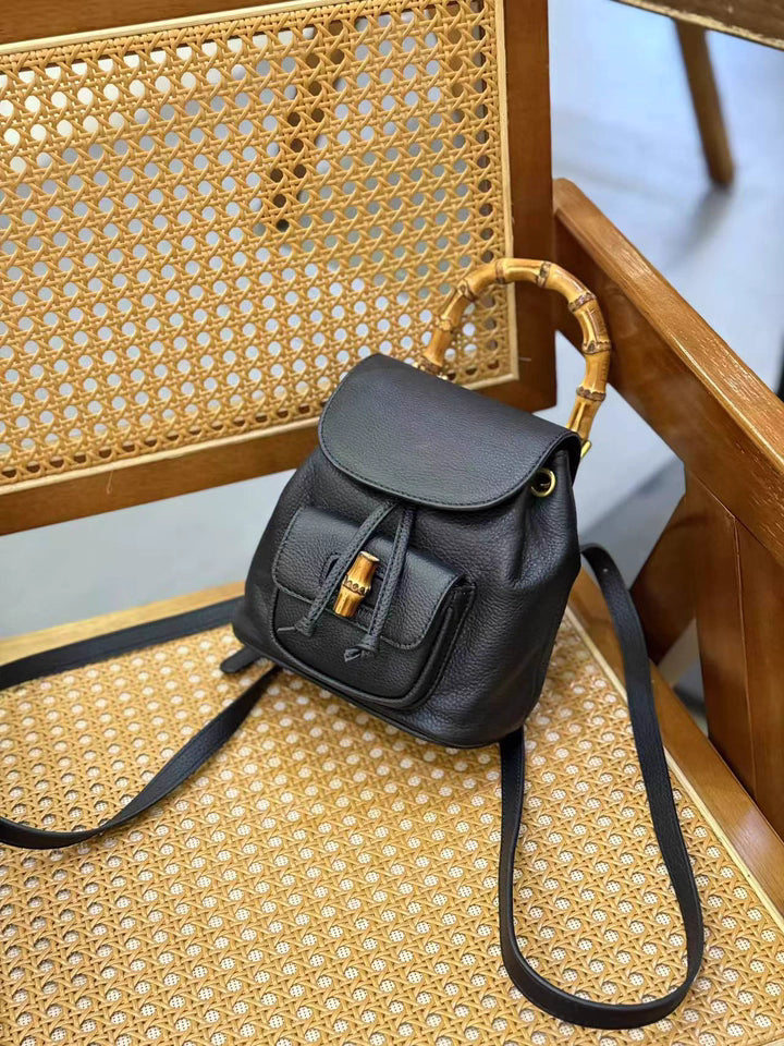 Handmade Cowhide Leather Mini Bamboo Convertible Backpack | Leather Drawstring Shoulder & Handbag for Women