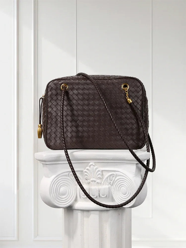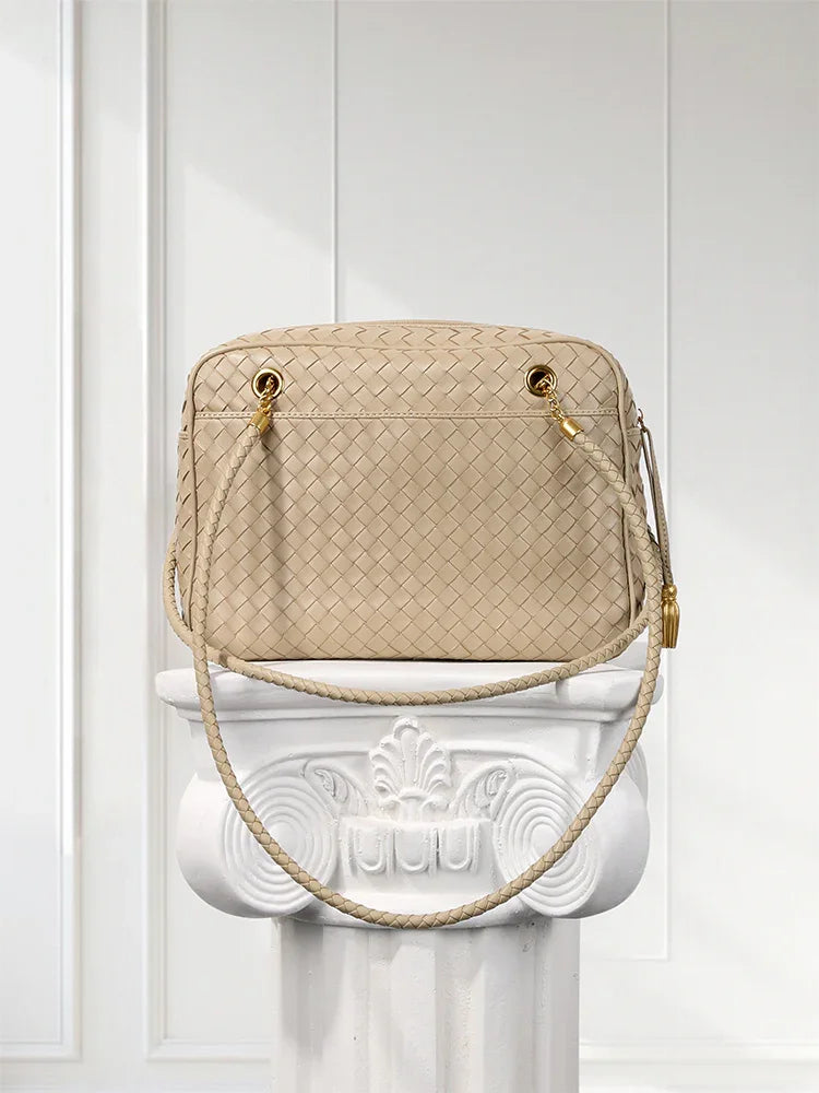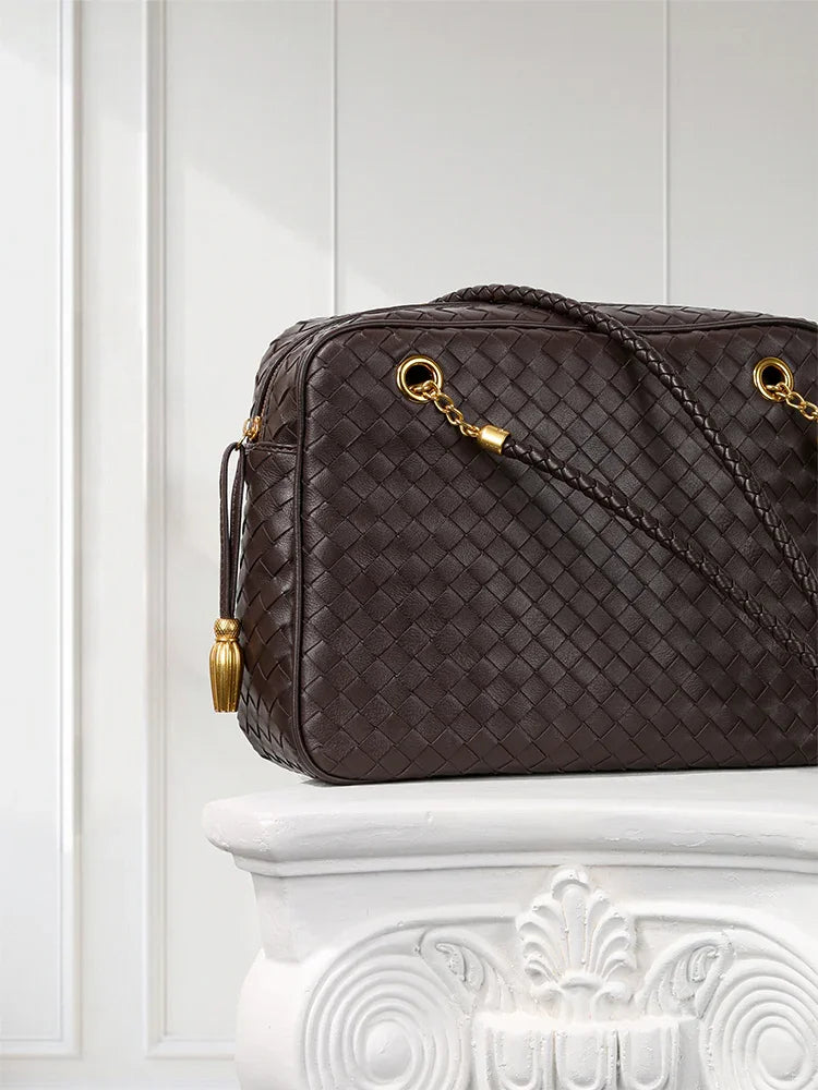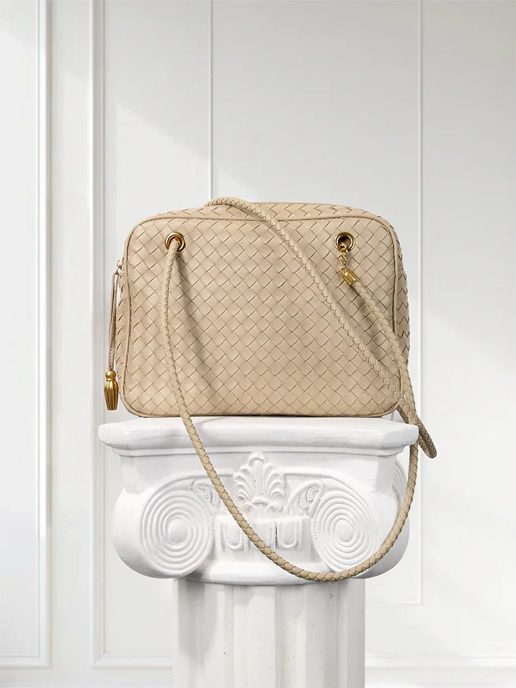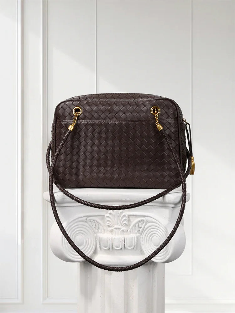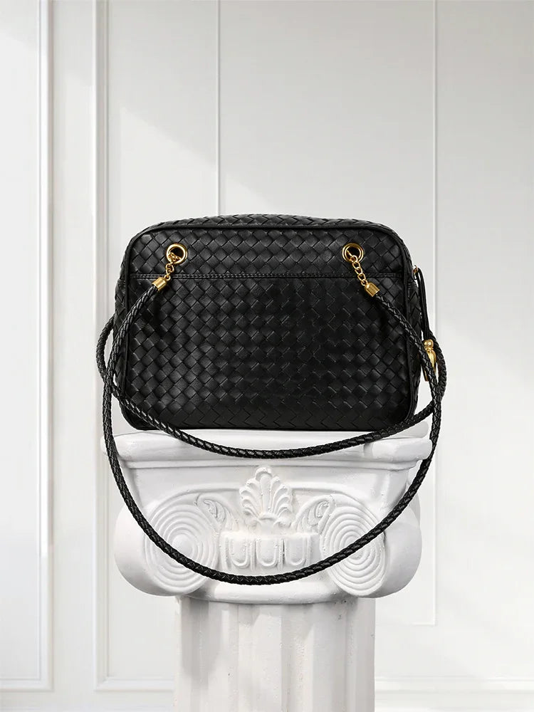 Redefine timeless elegance with our handcrafted lambskin leather shoulder bag, designed in a chic box silhouette with a vintage bowling bag touch. The intricate woven finish highlights exceptional craftsmanship, while the soft lambskin adds a luxurious texture that feels as good as it looks.