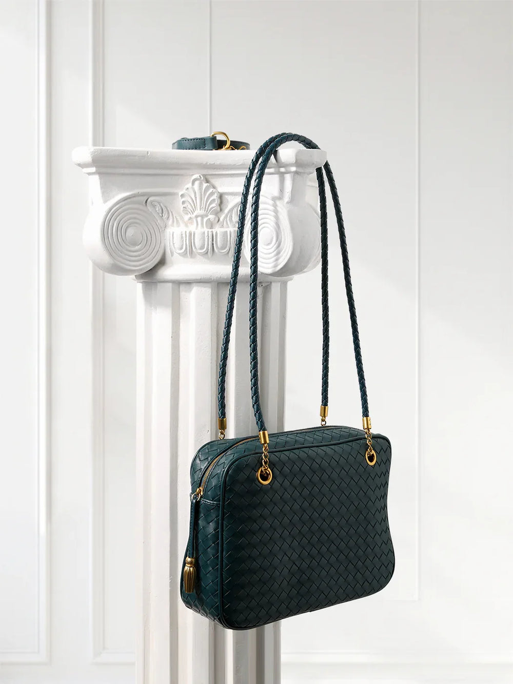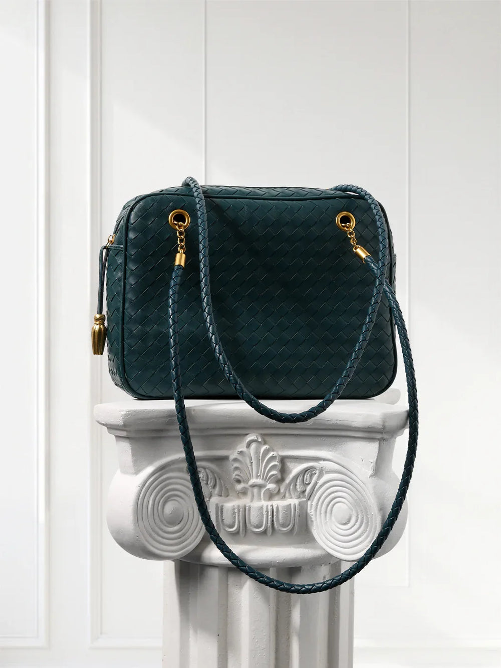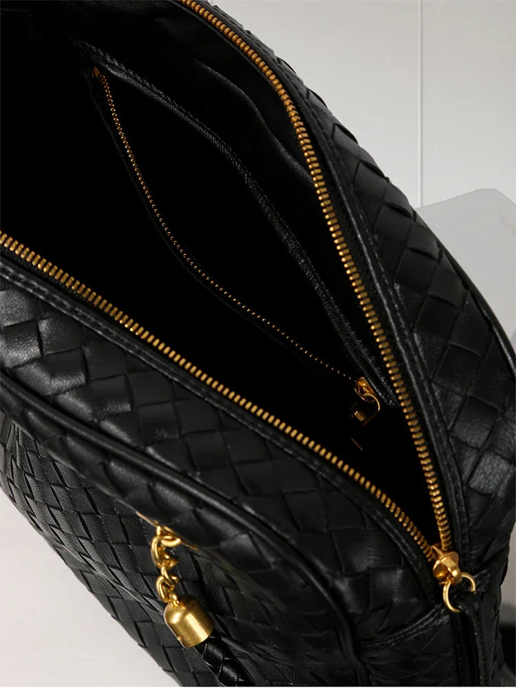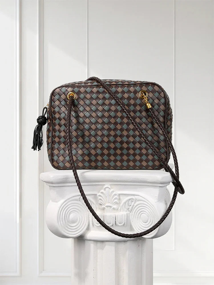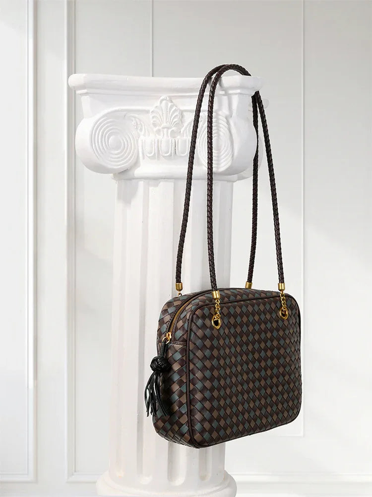 Redefine timeless elegance with our handcrafted lambskin leather shoulder bag, designed in a chic box silhouette with a vintage bowling bag touch. The intricate woven finish highlights exceptional craftsmanship, while the soft lambskin adds a luxurious texture that feels as good as it looks.