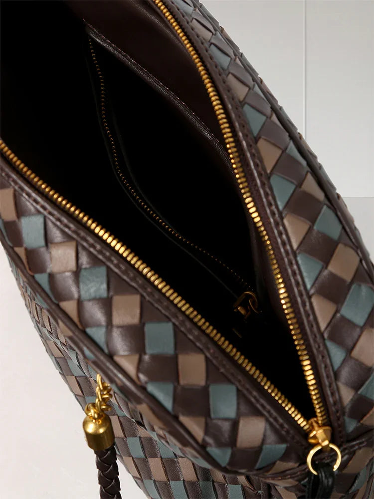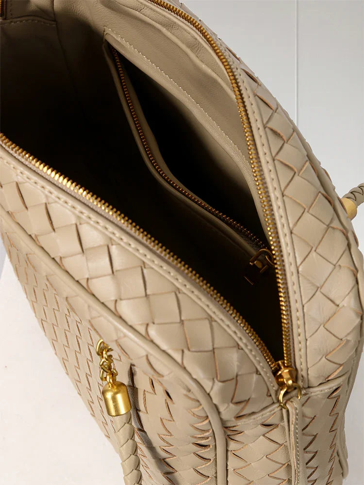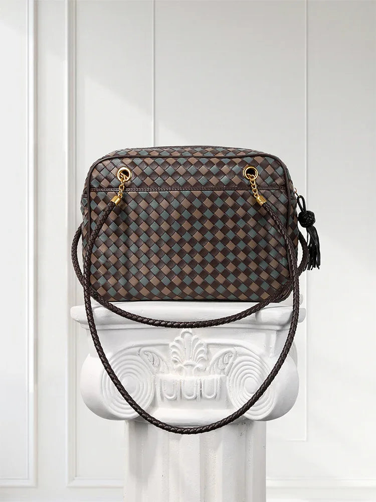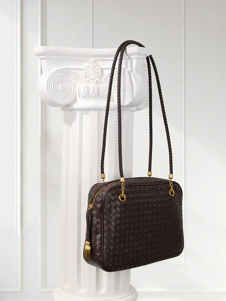 Handmade Woven Lambskin Leather Shoulder Bag, Luxury Box Purse, Vintage Bowling Style Women’s Commuter Handbag