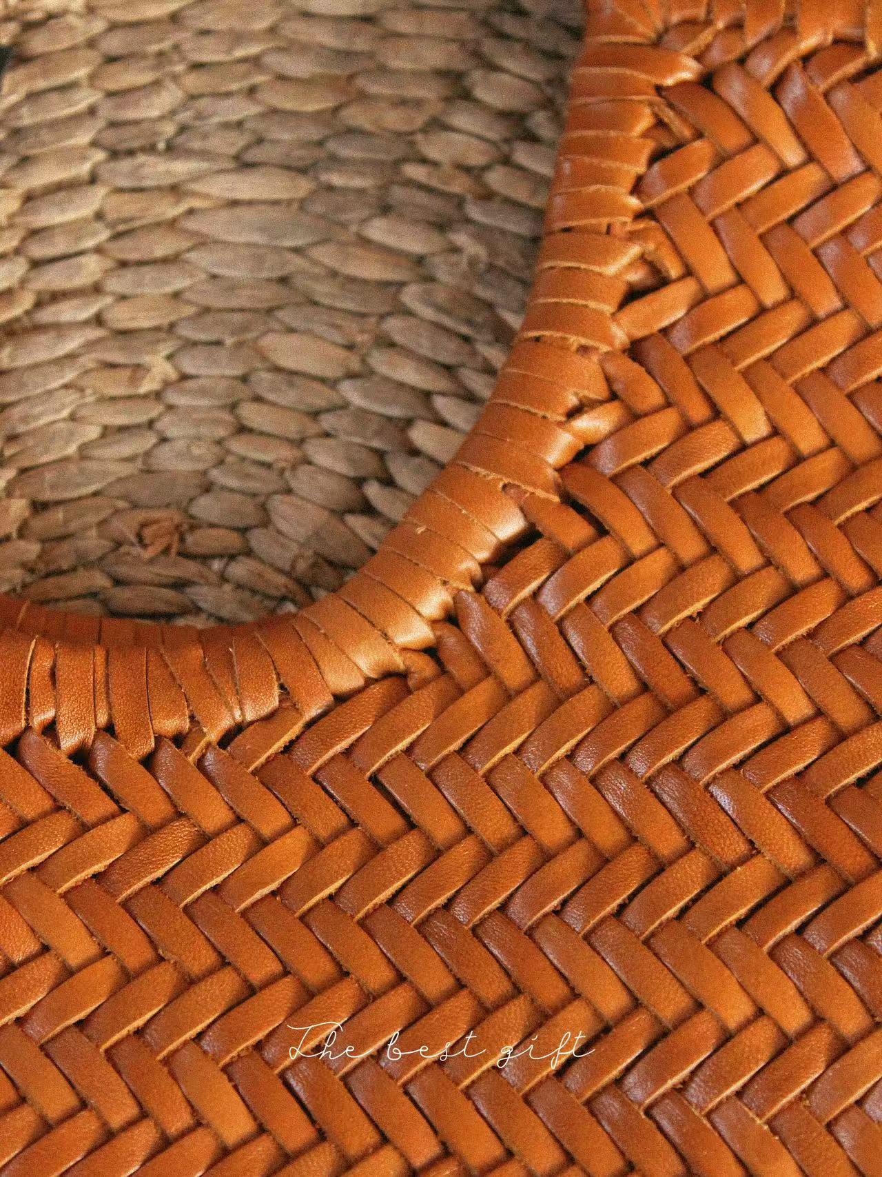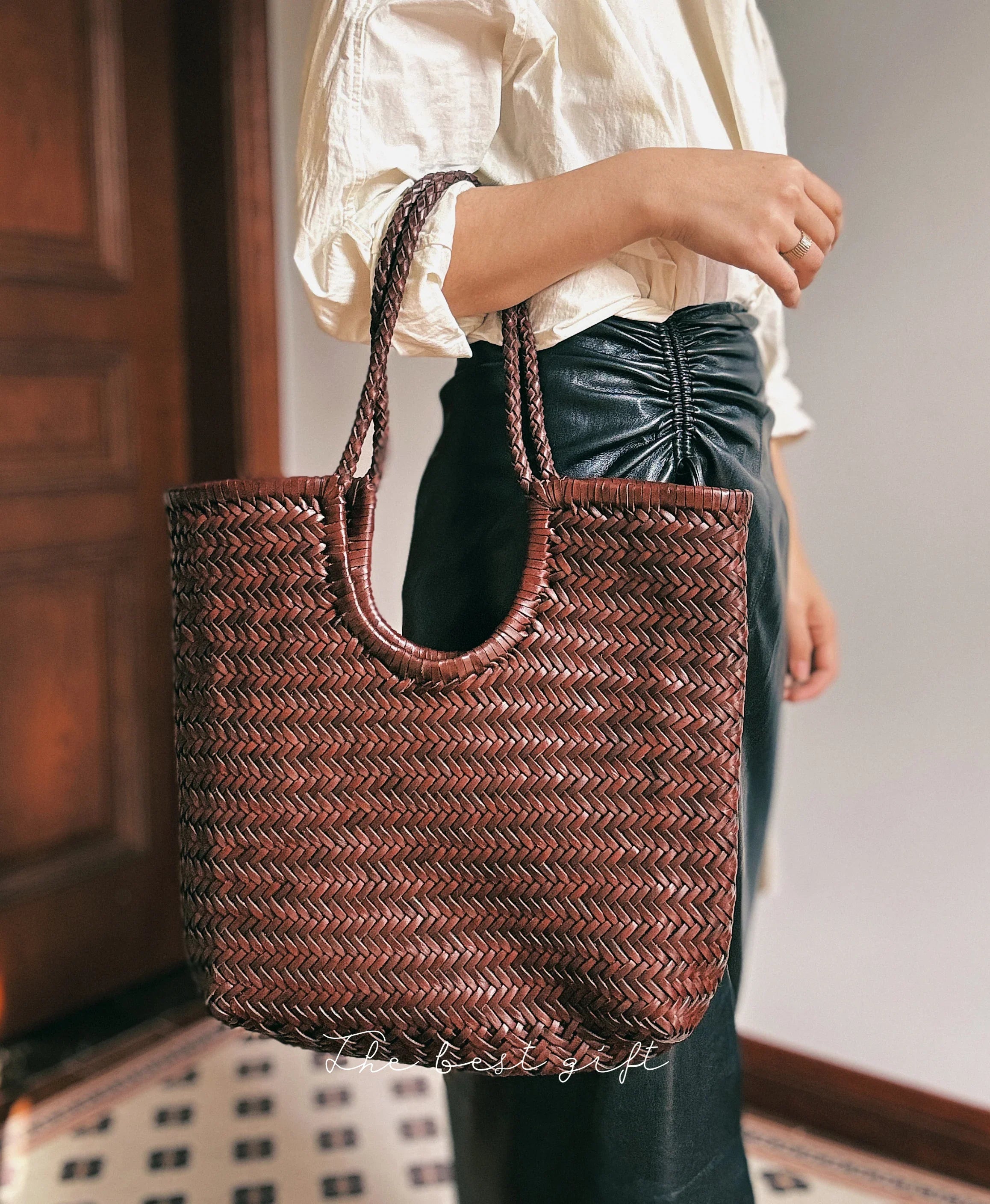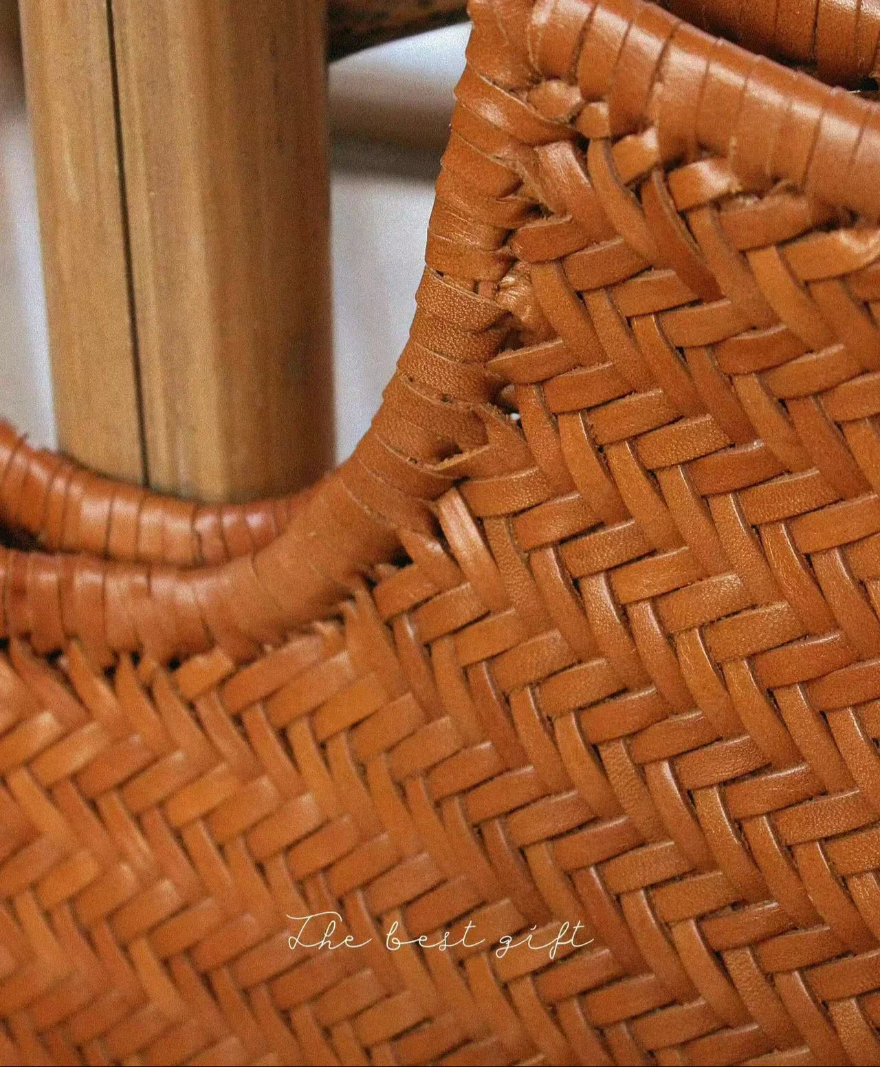 Italy Cowhide Leather Summer Woven Bag, Woven Triple Jump Bamboo Style HandBag, Beach Bag, Basket Bag, Hobo Leather Bag, Gift For Her