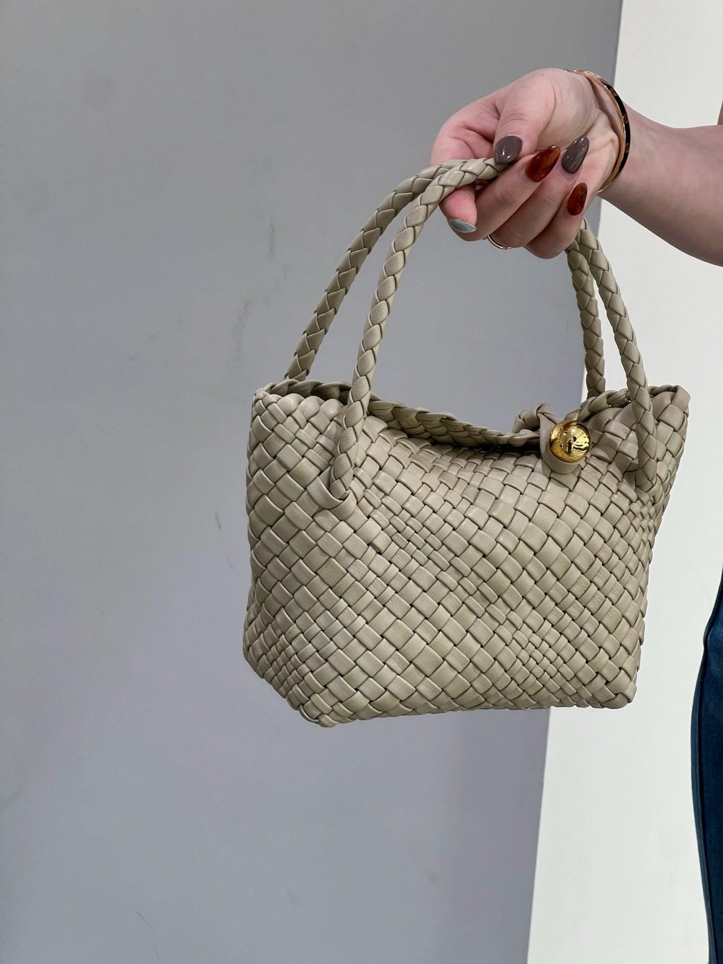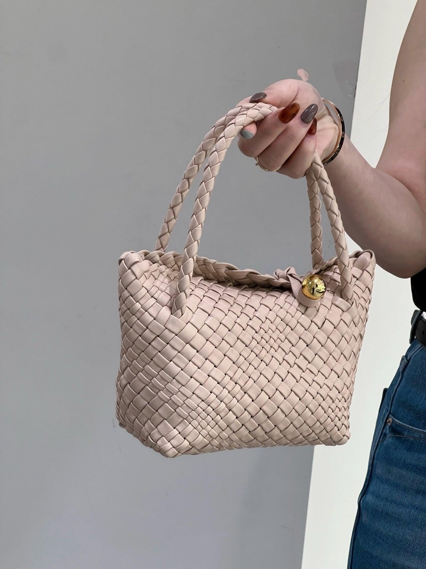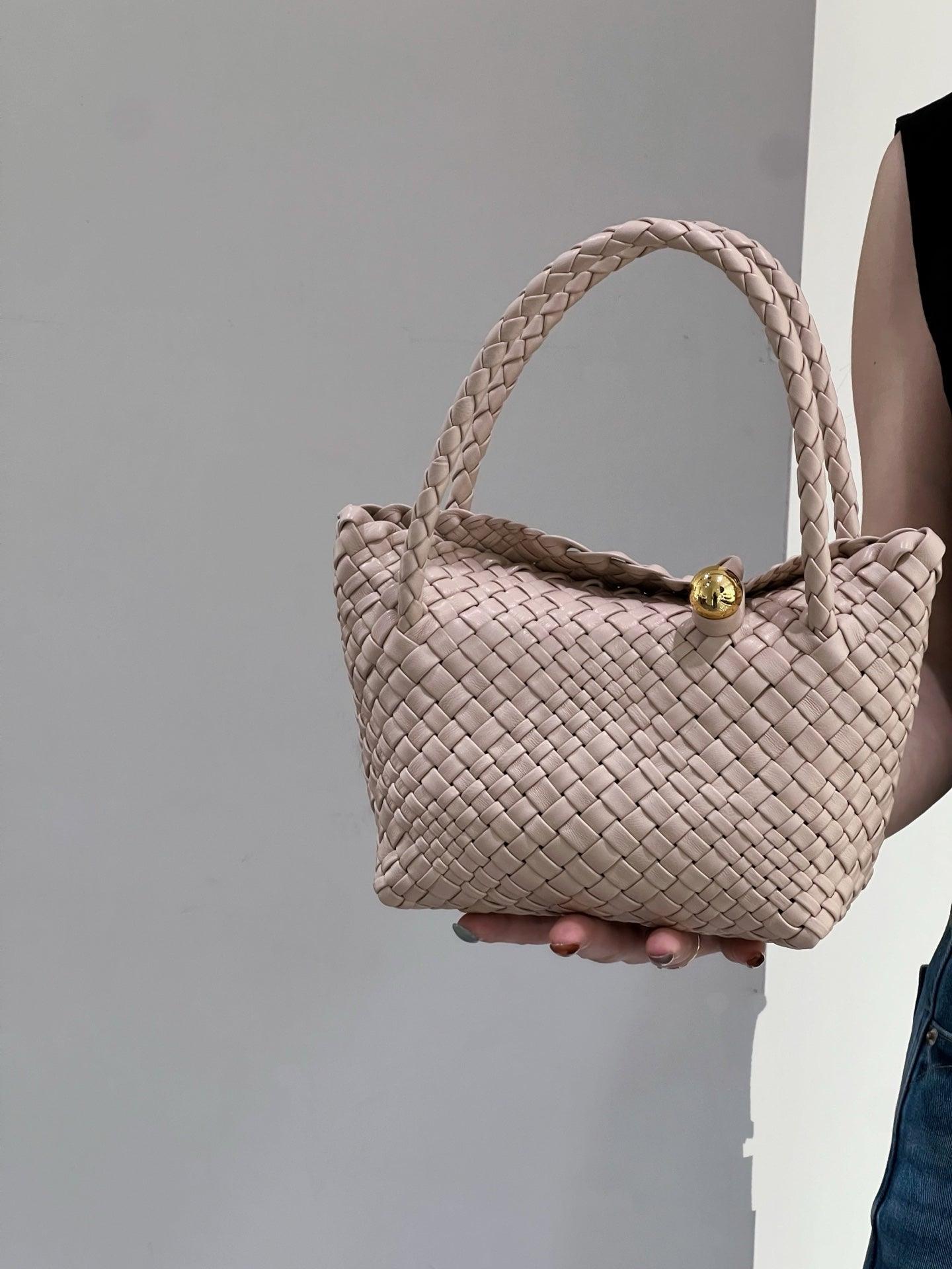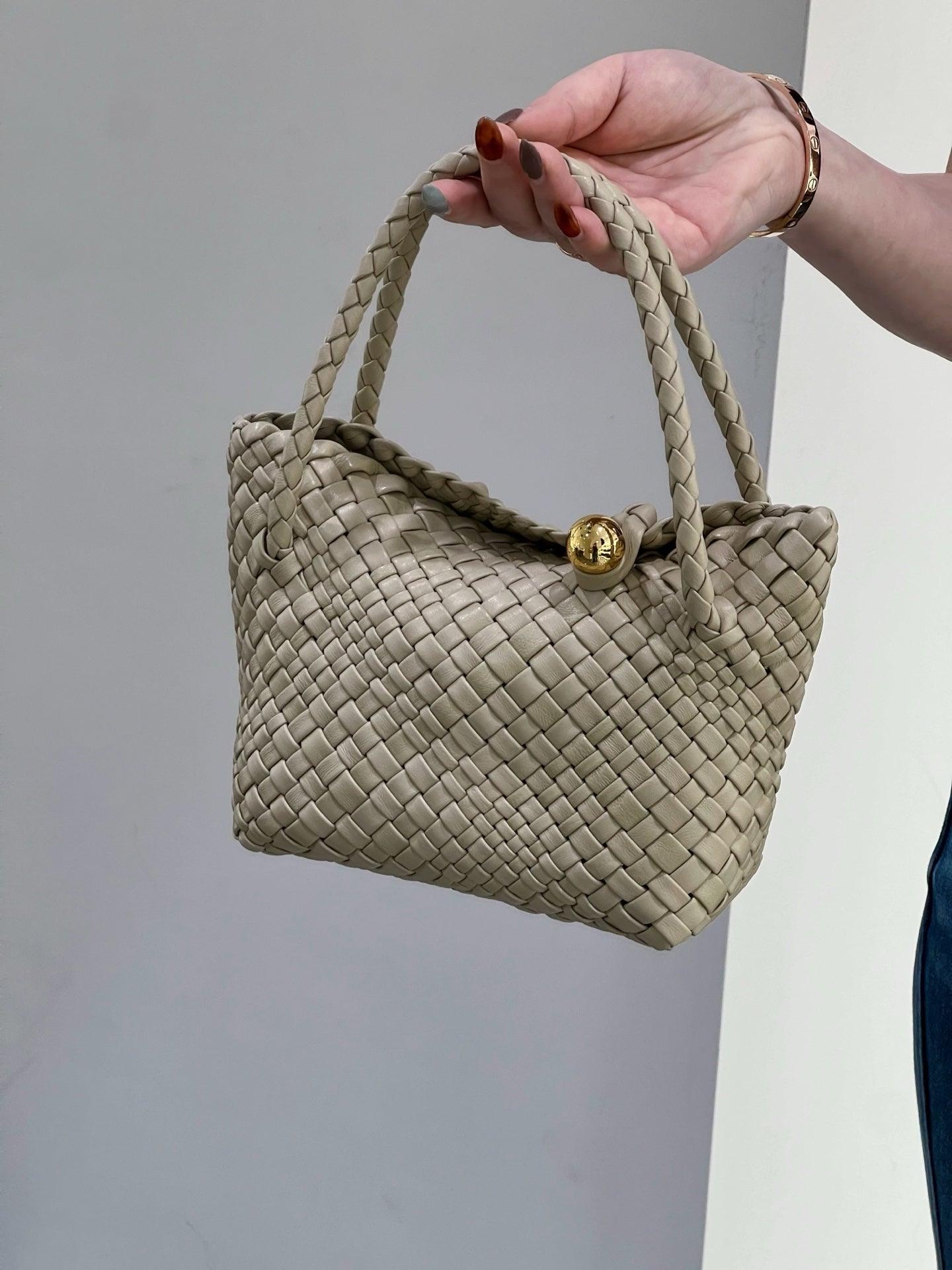 Luxury Handwoven Lambskin Leather Shoulder Bucket Bag with Sculptural Gold Sphere Closure and Double Handle Design – Spacious & Versatile Carryall
