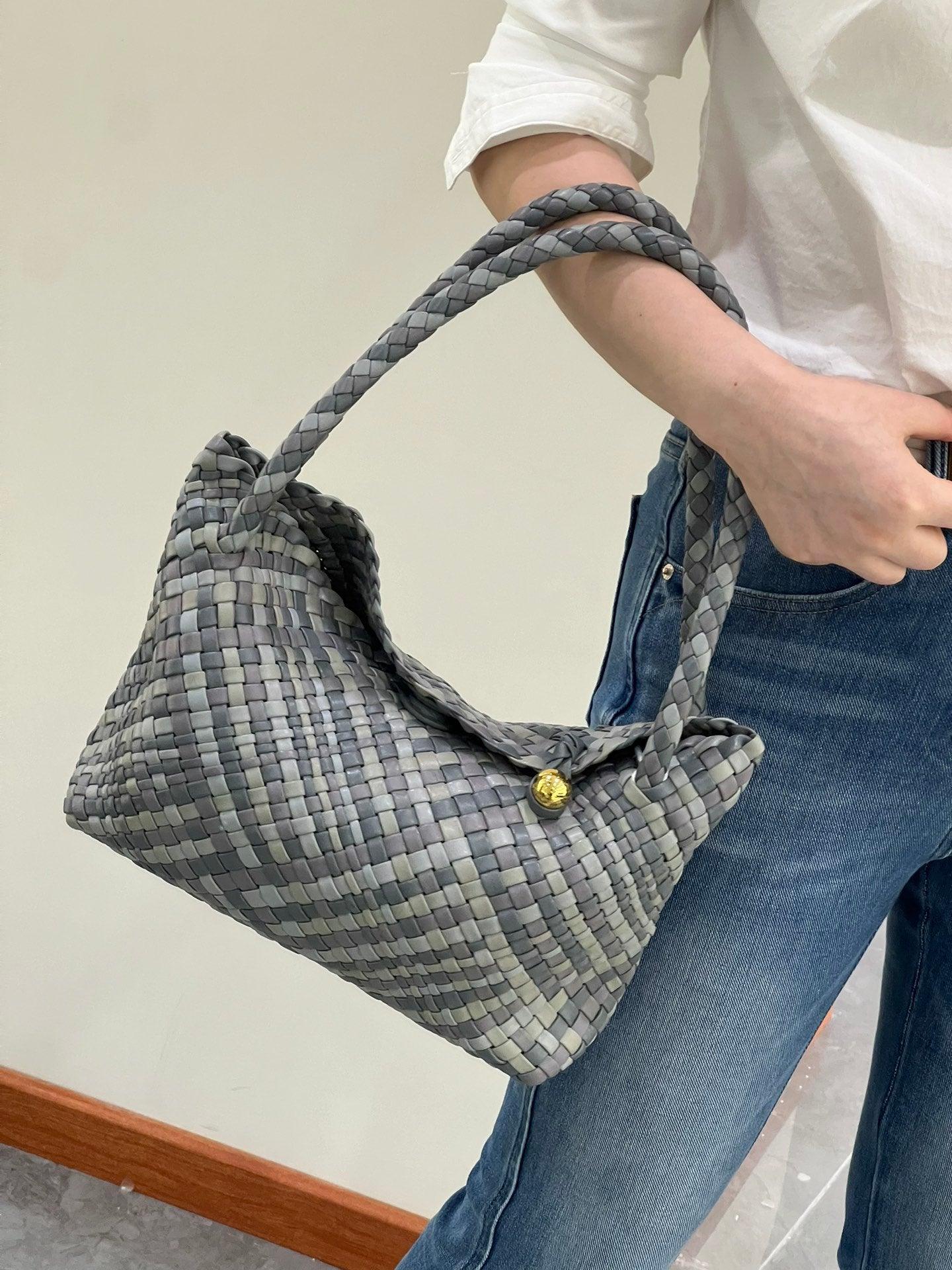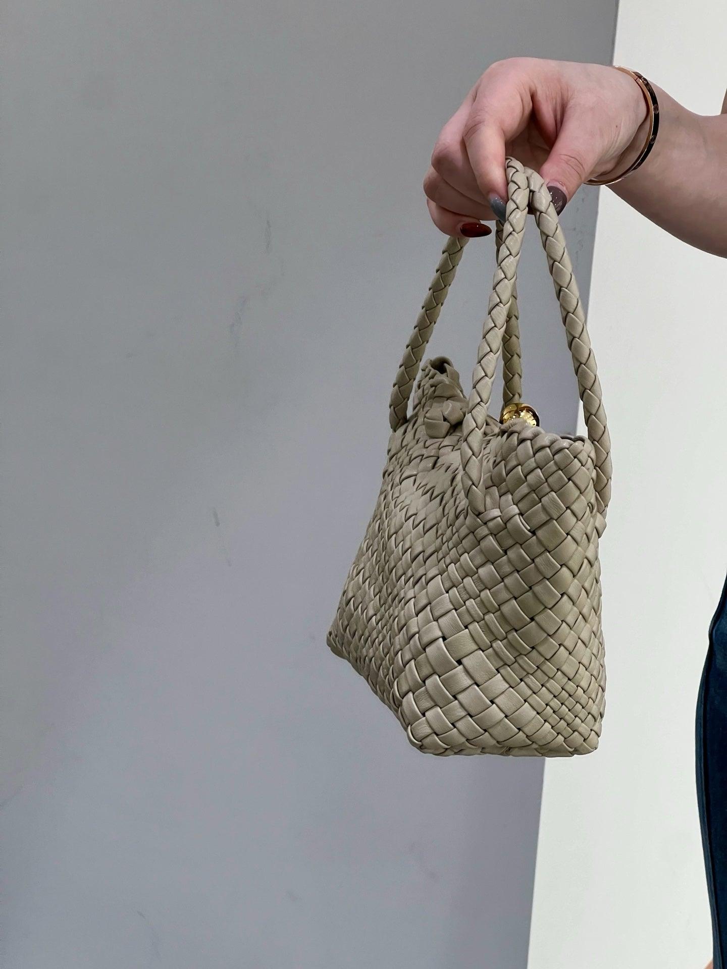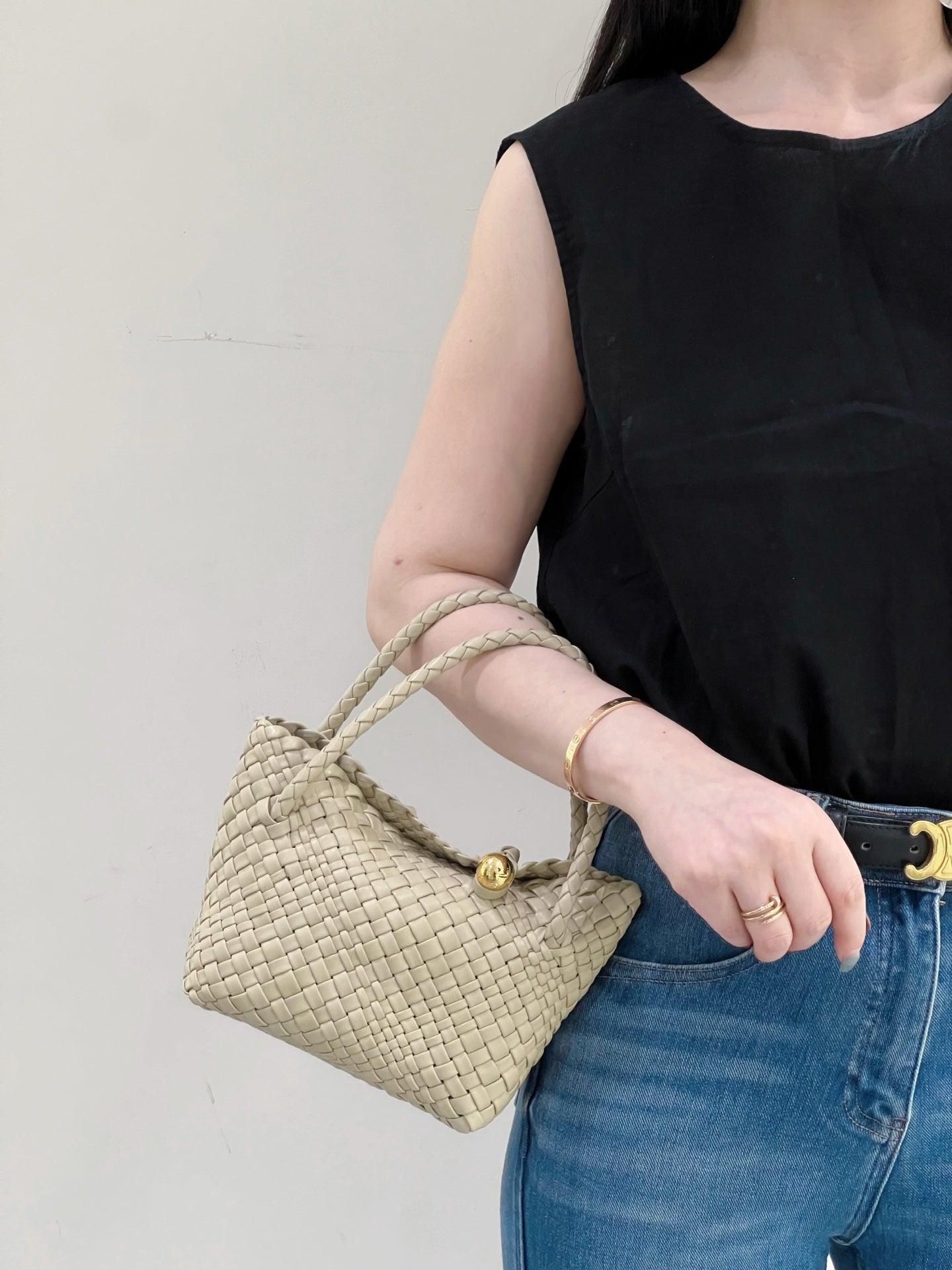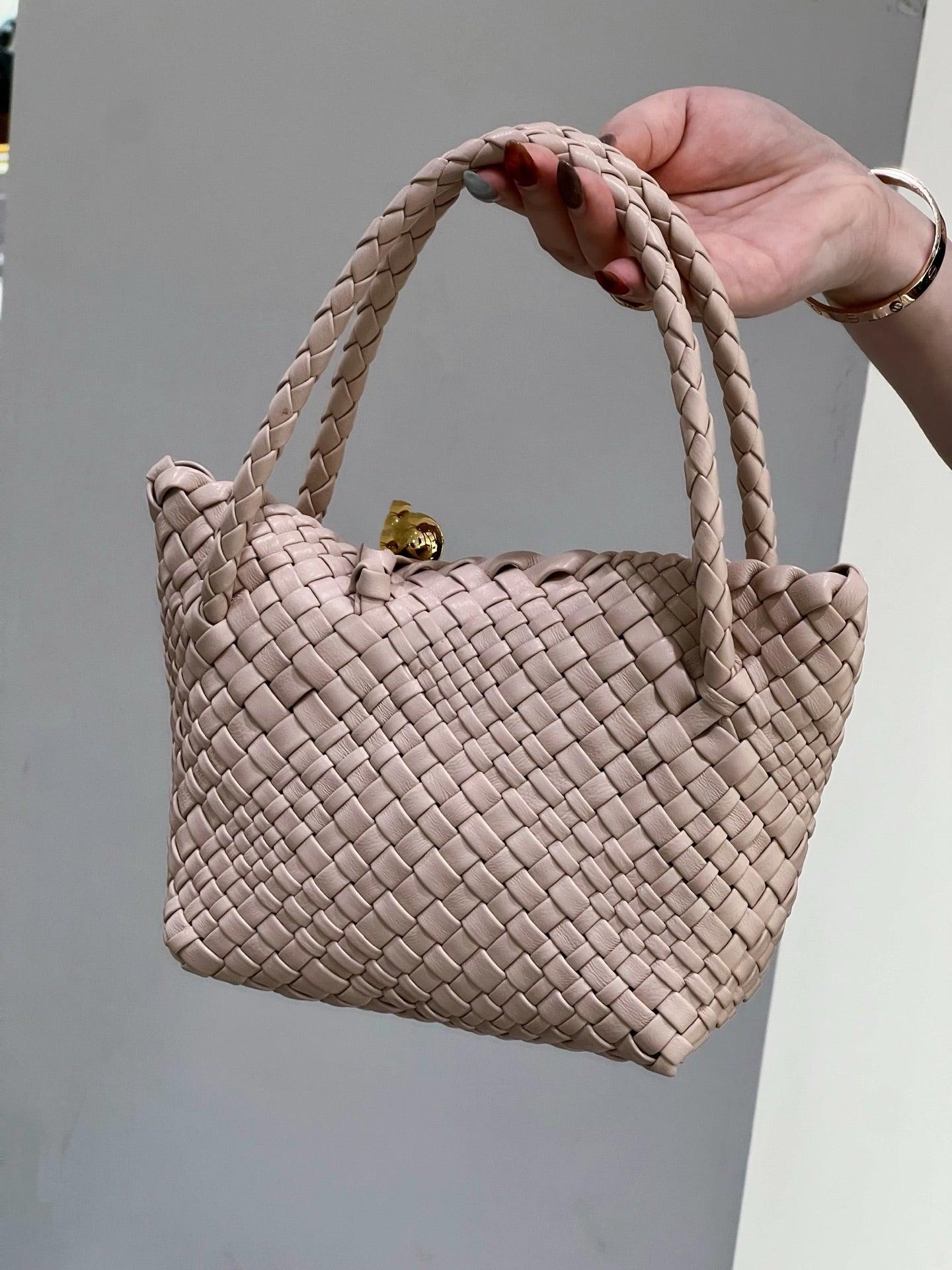 Luxury Handwoven Lambskin Leather Shoulder Bucket Bag with Sculptural Gold Sphere Closure and Double Handle Design – Spacious & Versatile Carryall
