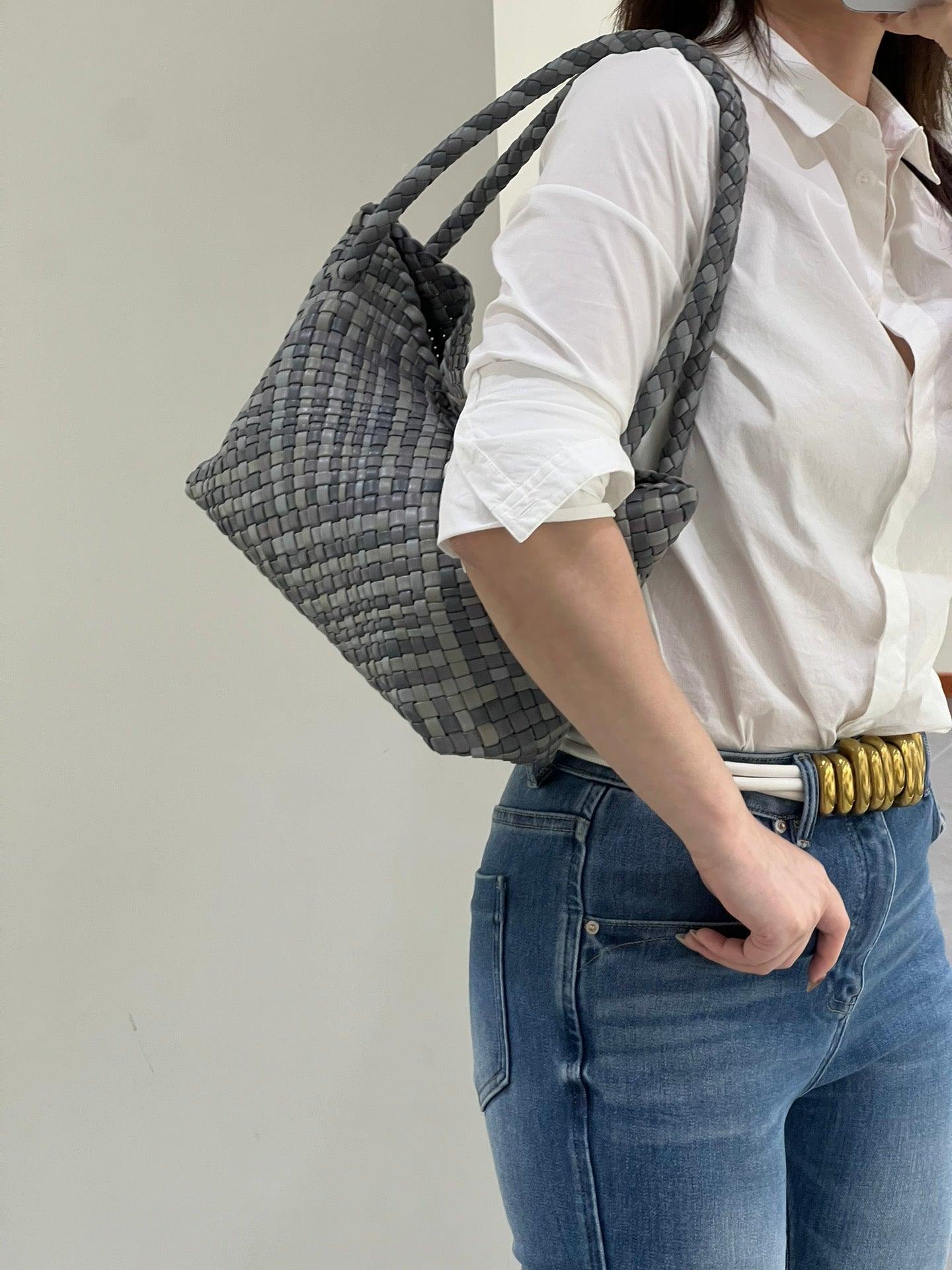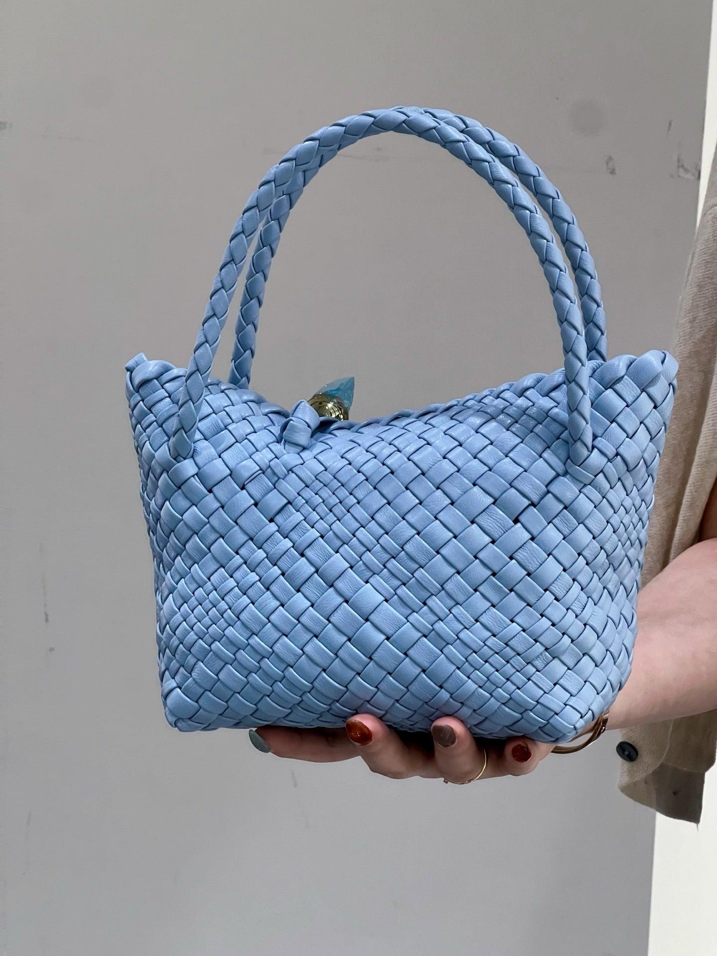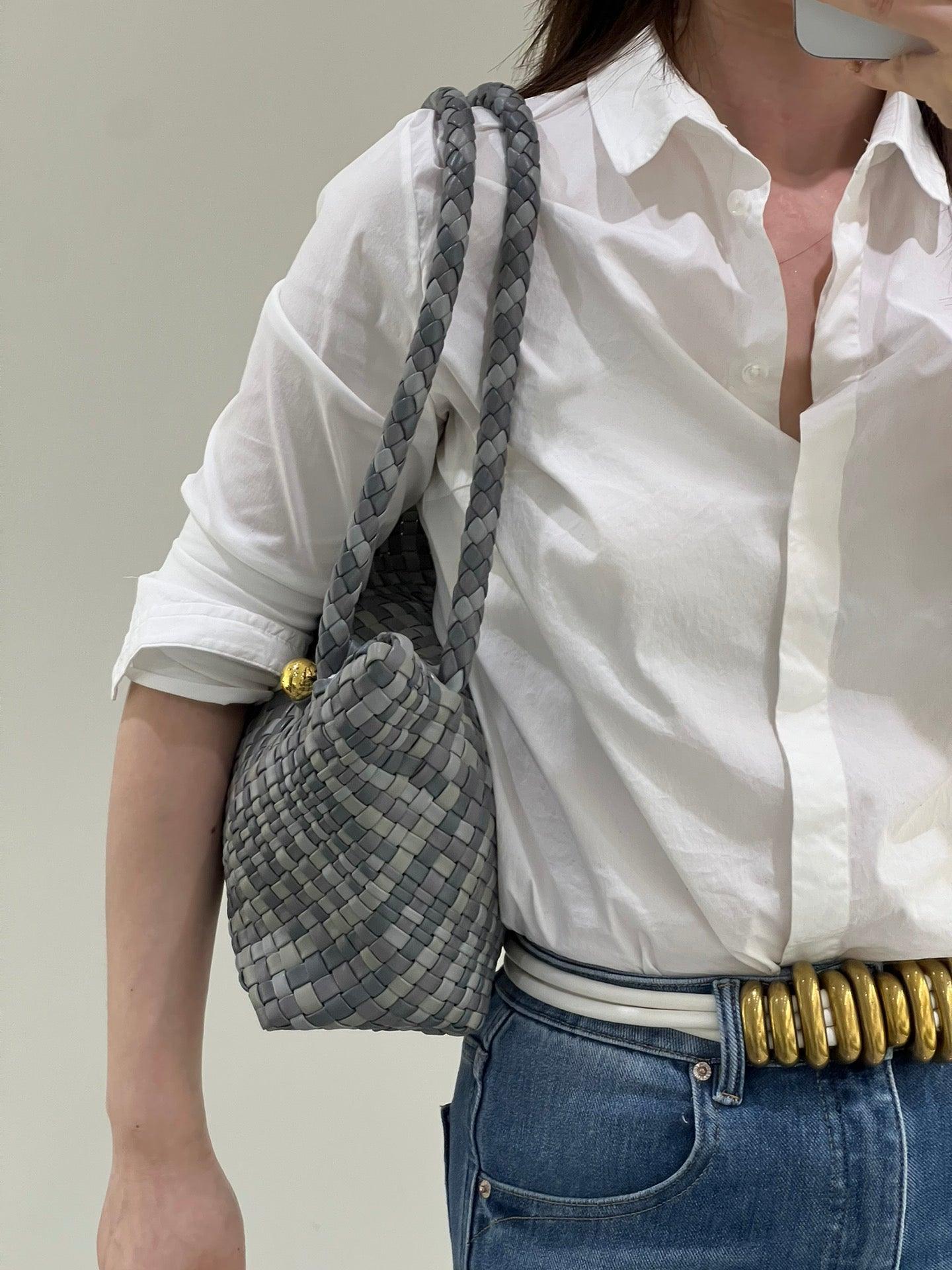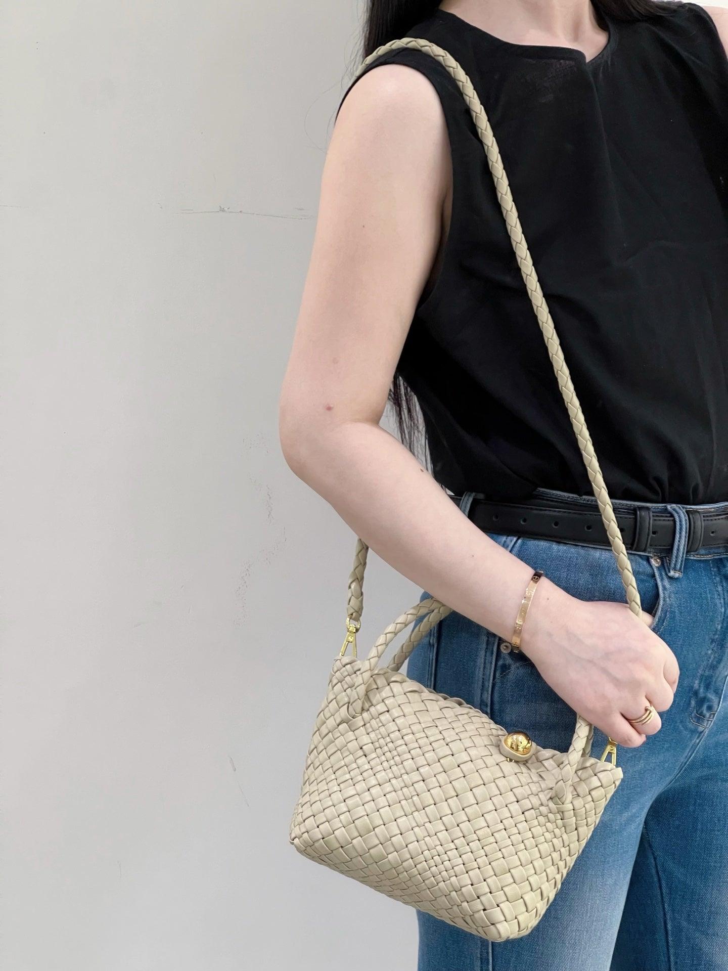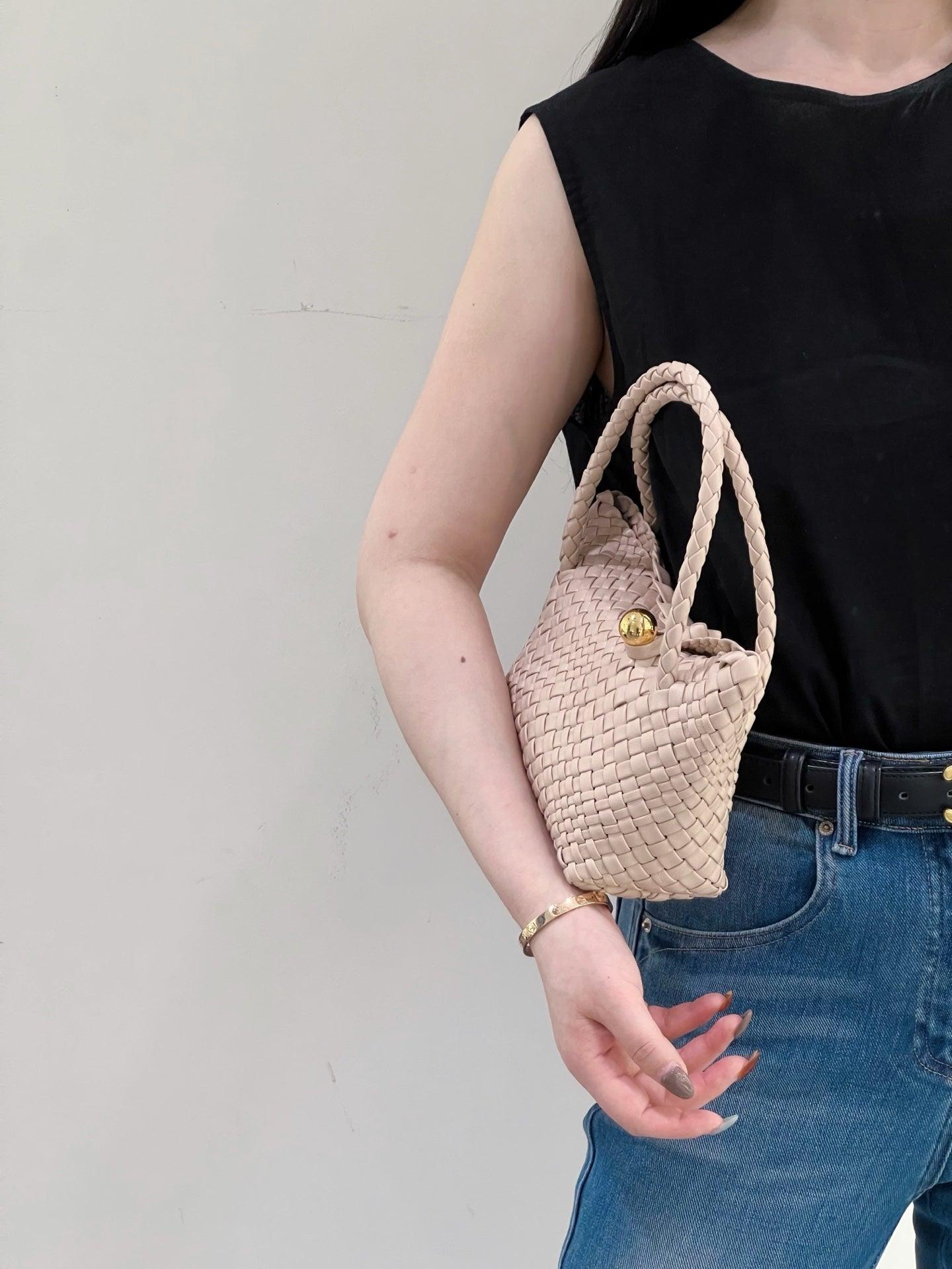 Luxury Handwoven Lambskin Leather Shoulder Bucket Bag with Sculptural Gold Sphere Closure and Double Handle Design – Spacious & Versatile Carryall