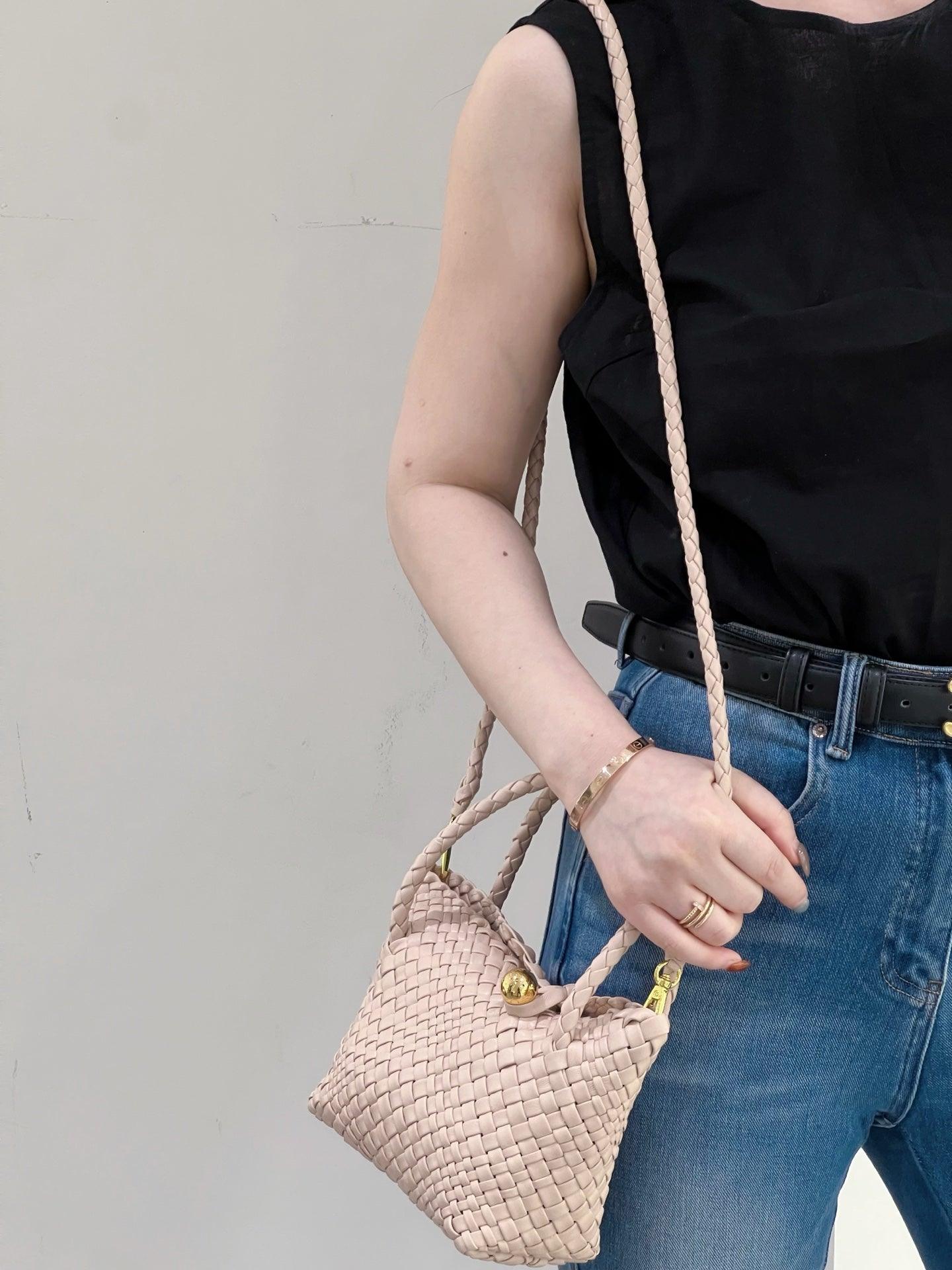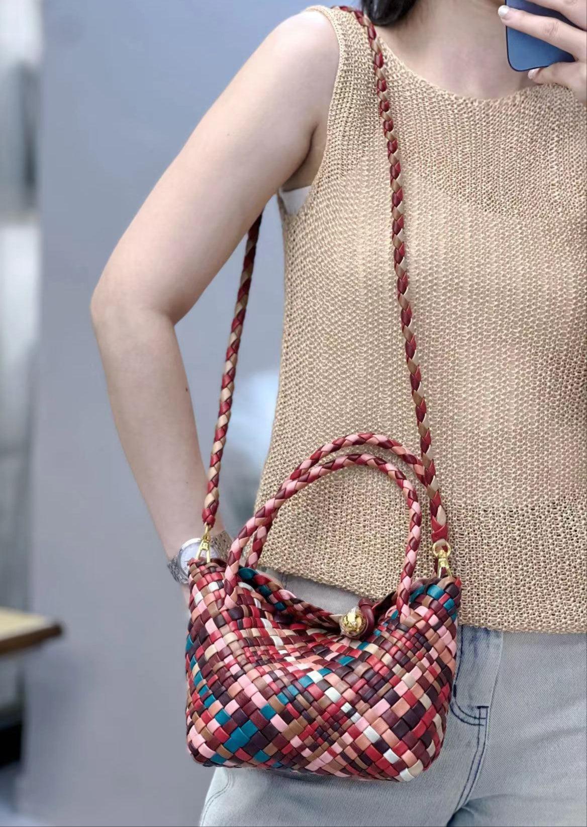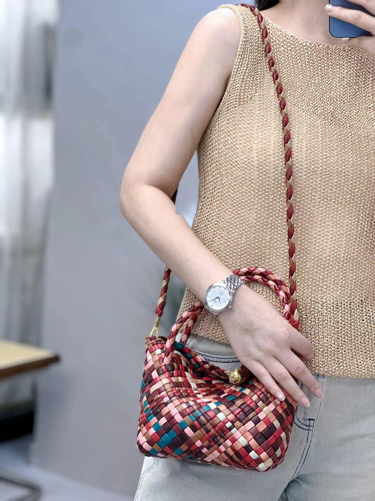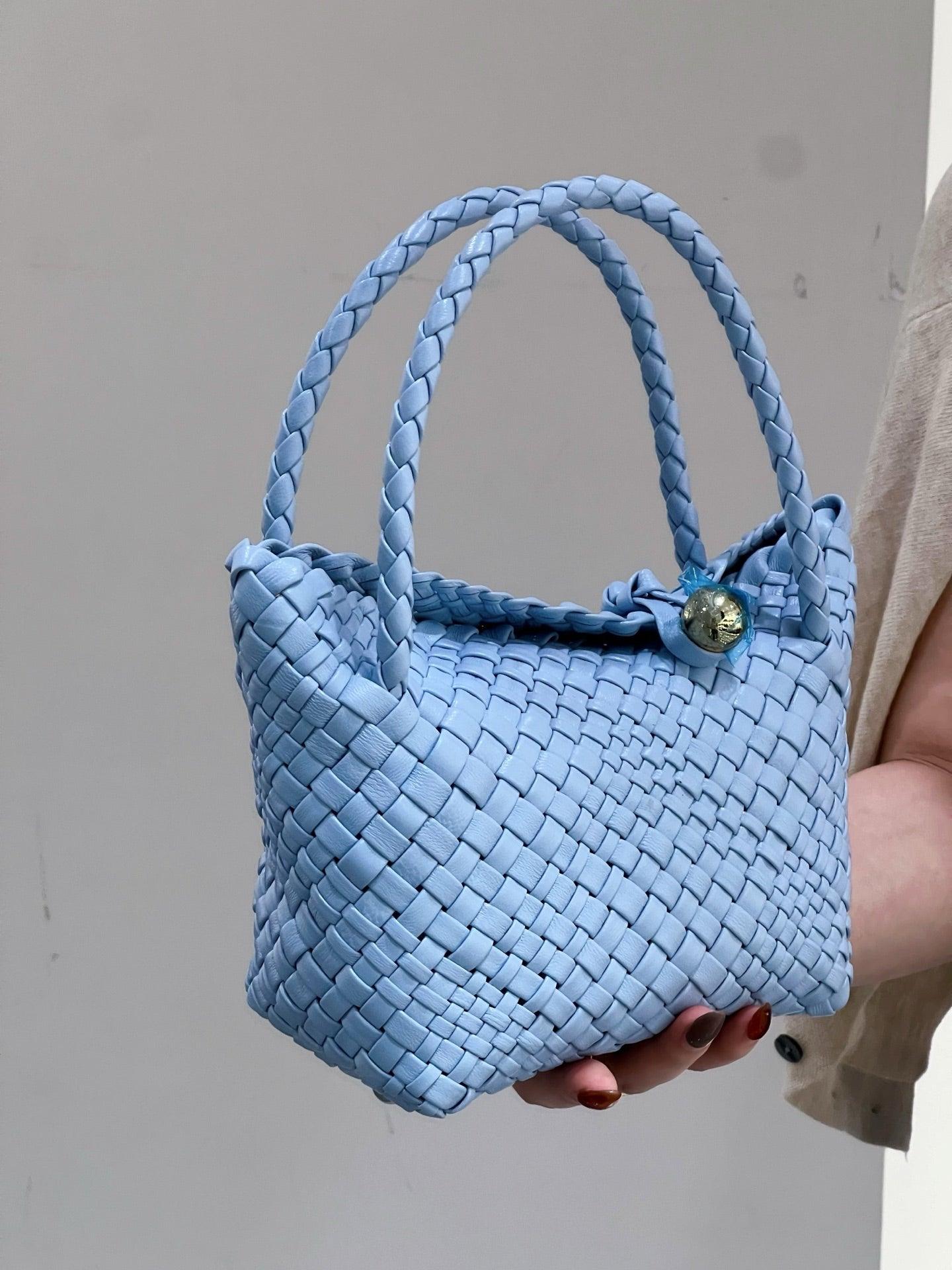 Luxury Handwoven Lambskin Leather Shoulder Bucket Bag with Sculptural Gold Sphere Closure and Double Handle Design – Spacious & Versatile Carryall
