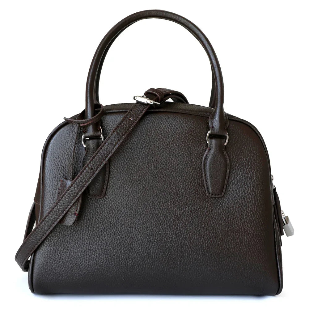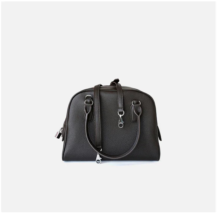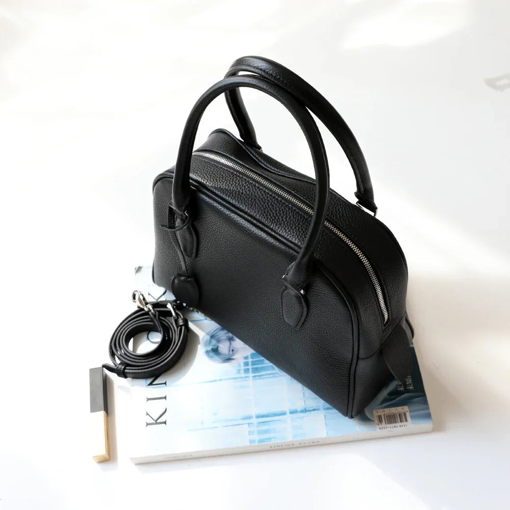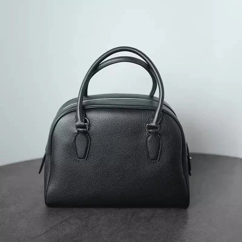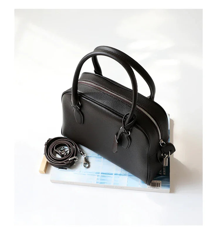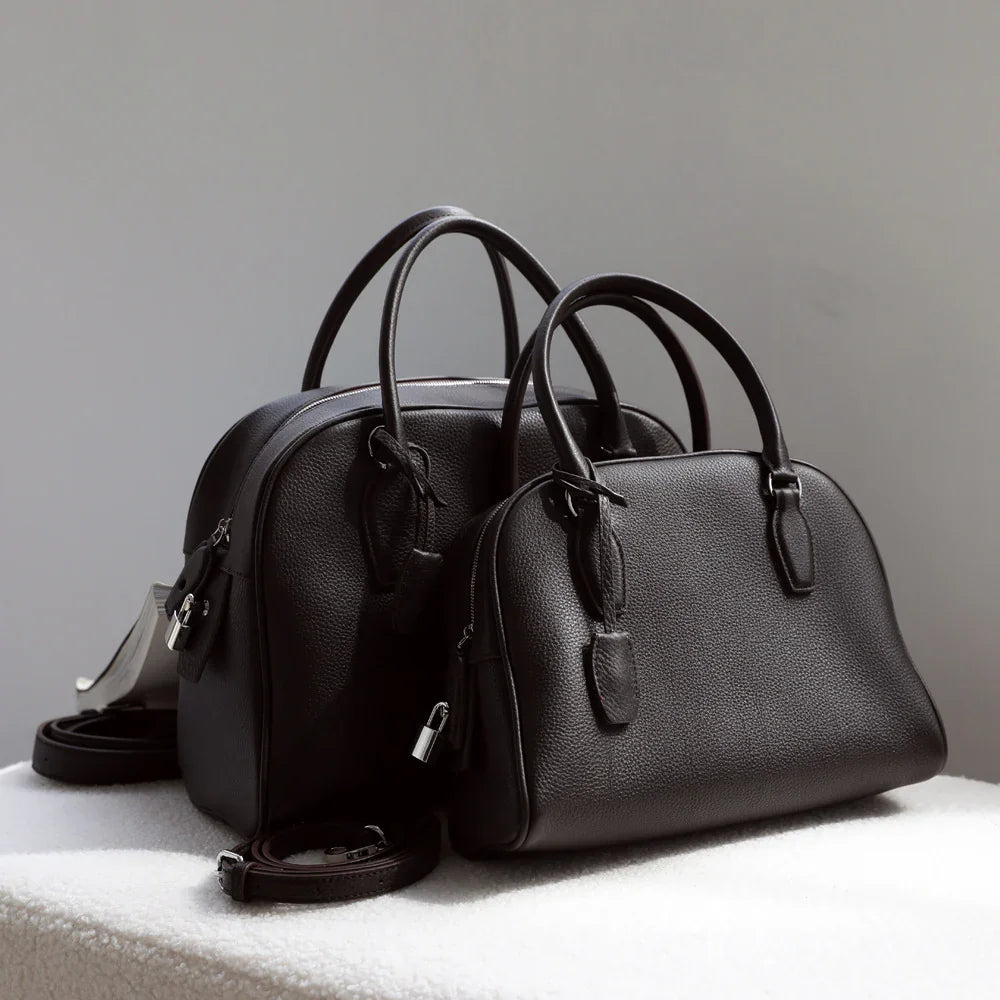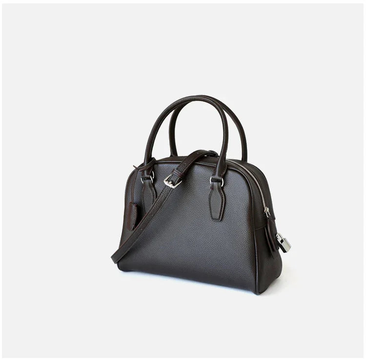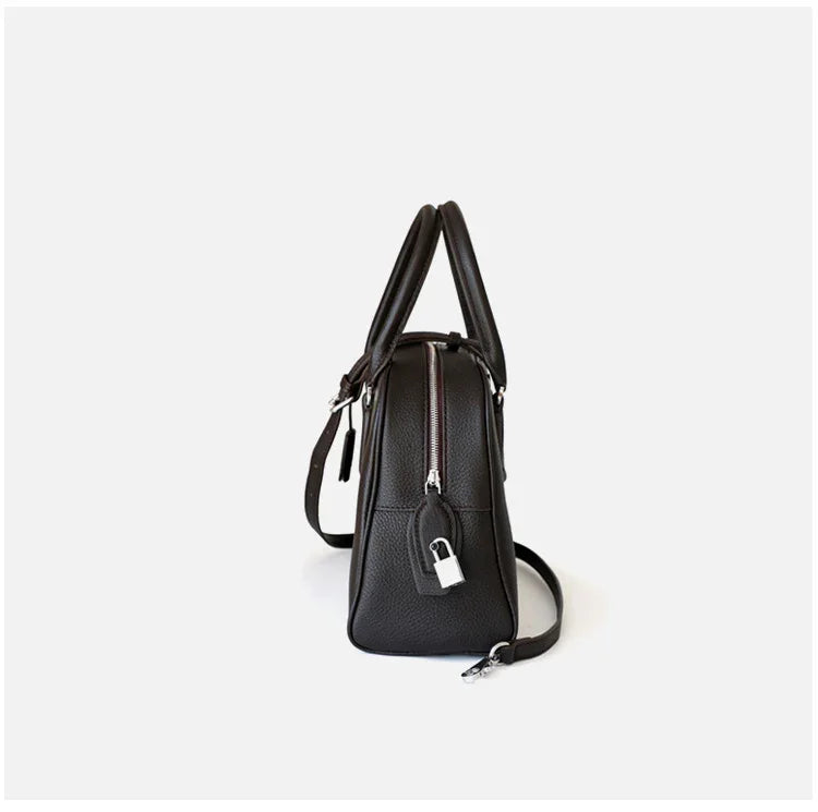 Luxury Pebbled Cowhide Leather Bowling Bag with Lock | Women’s Commuter Tote, Shoulder & Crossbody Handbag