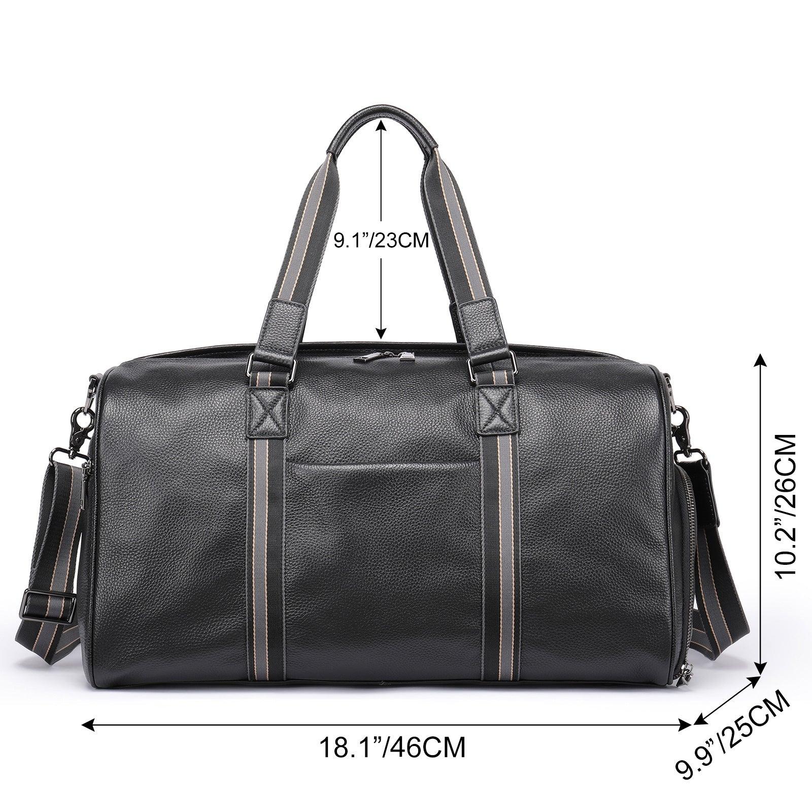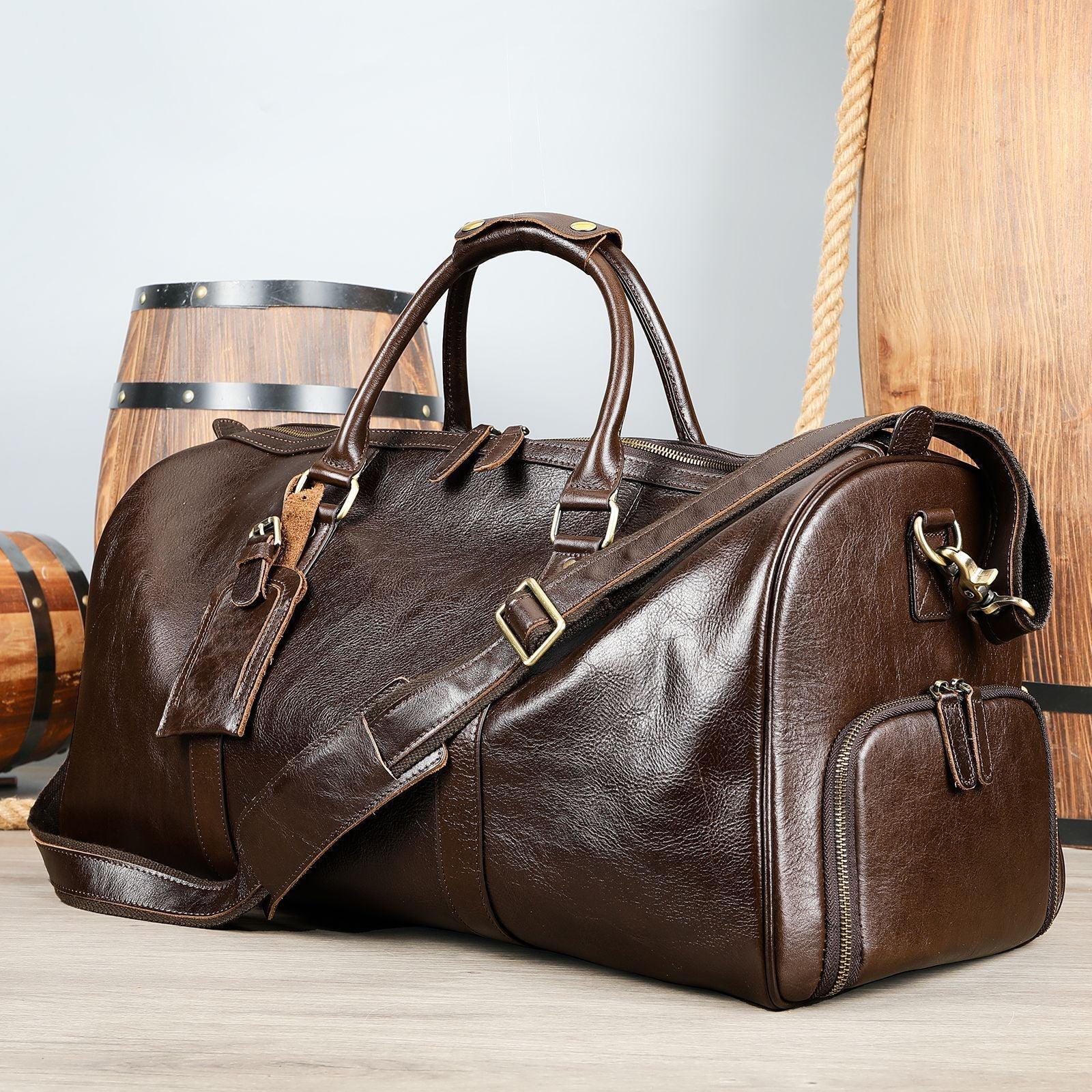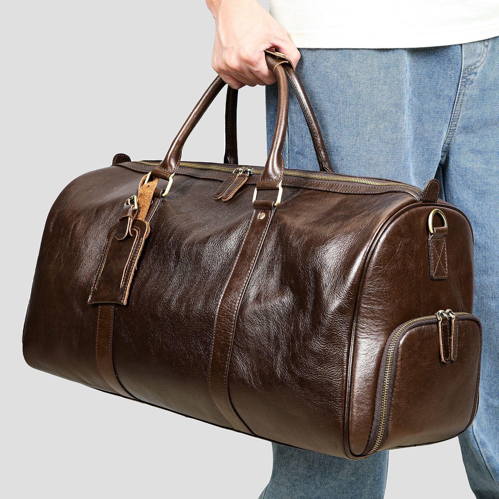 Men's Leather Travel Duffel Bag - Grain Leather Gym Bag with Shoe Compartment, Handheld and Crossbody Carry, Large Weekender Bag