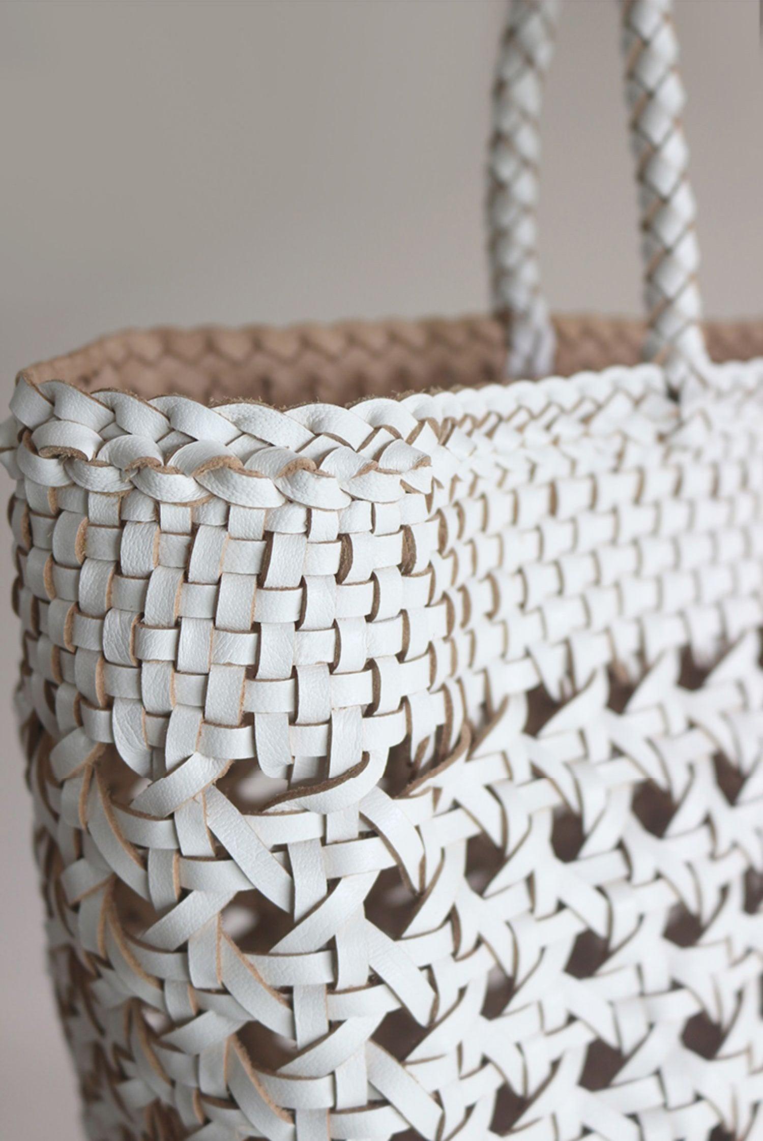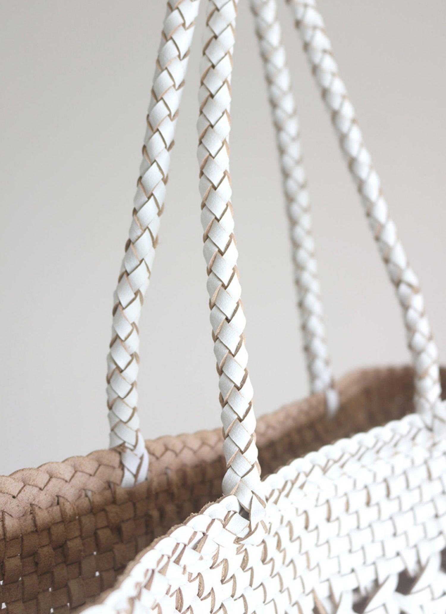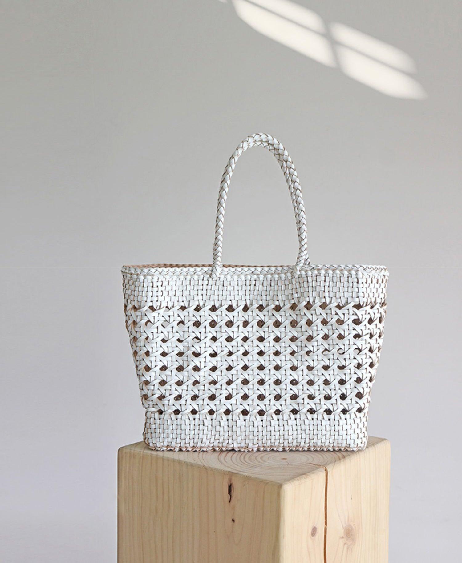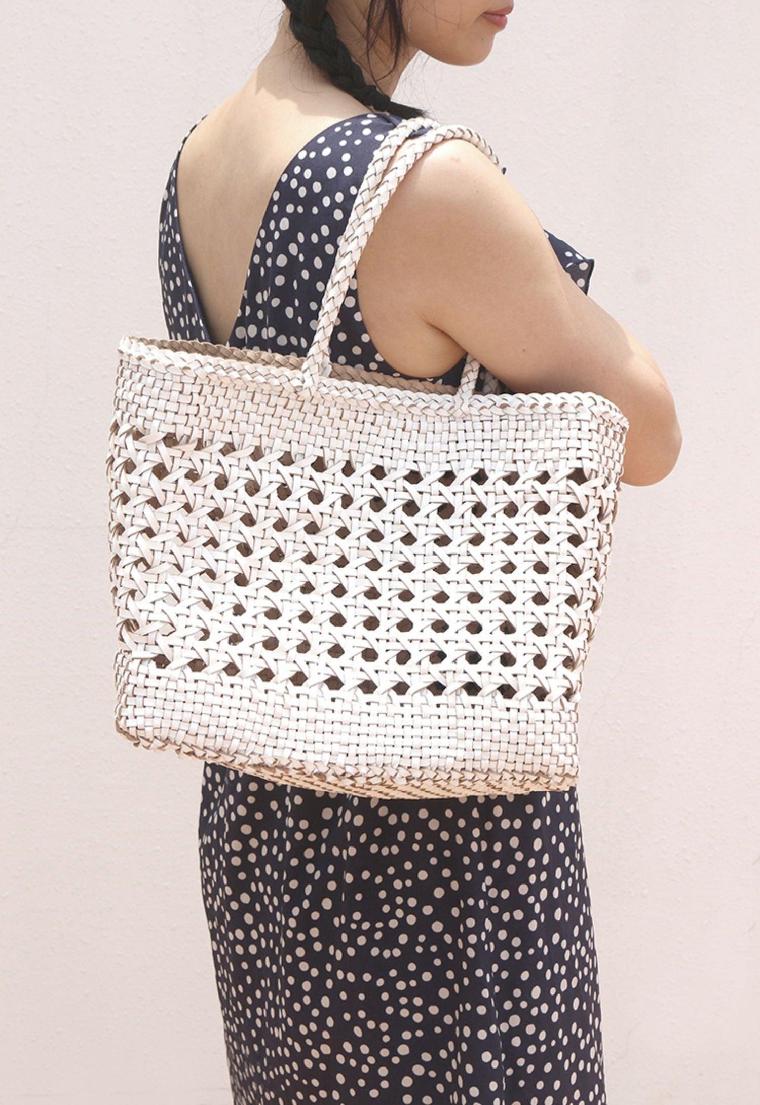 White Genuine Leather Hand Woven Cuboid Shaped Ladies TOTE, Open Rattan Woven Triple Jump Bamboo Ladies Hobo Holiday Bag, Beach Basket Bag